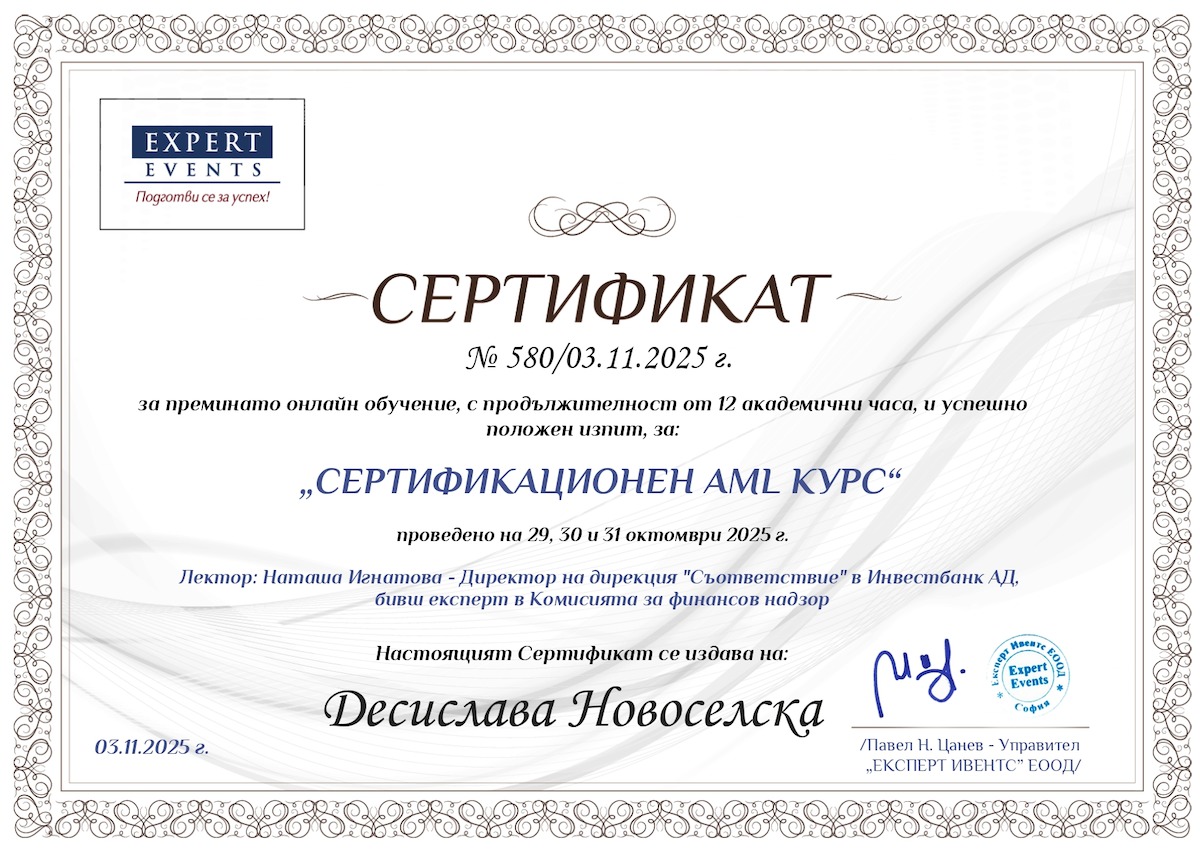 Десислава Новоселска е професионалист с дългогодишен опит в правото, недвижимите имоти, продажбите и консултантската дейност. Съчетава юридическа експертиза, бизнес мислене и силна ориентация към клиента, което ѝ позволява да предлага цялостни решения и високо качество на обслужване.
