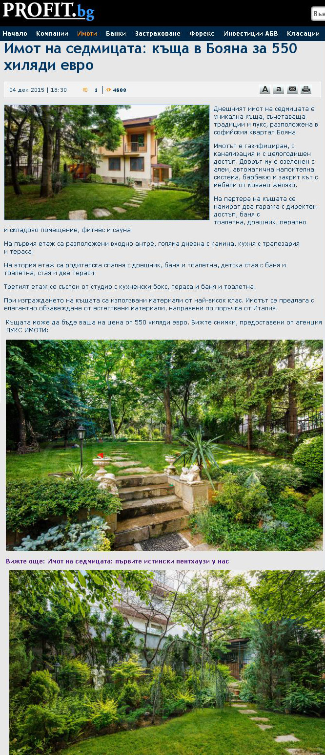 Най-популярният икономически портал в България Profit.bg избра за имот на седмицата уникална къща, съчетаваща традиции и лукс, разположена в софийския квартал Бояна. Къщата е обявена за продажба от ЛУКС ИМОТИ.