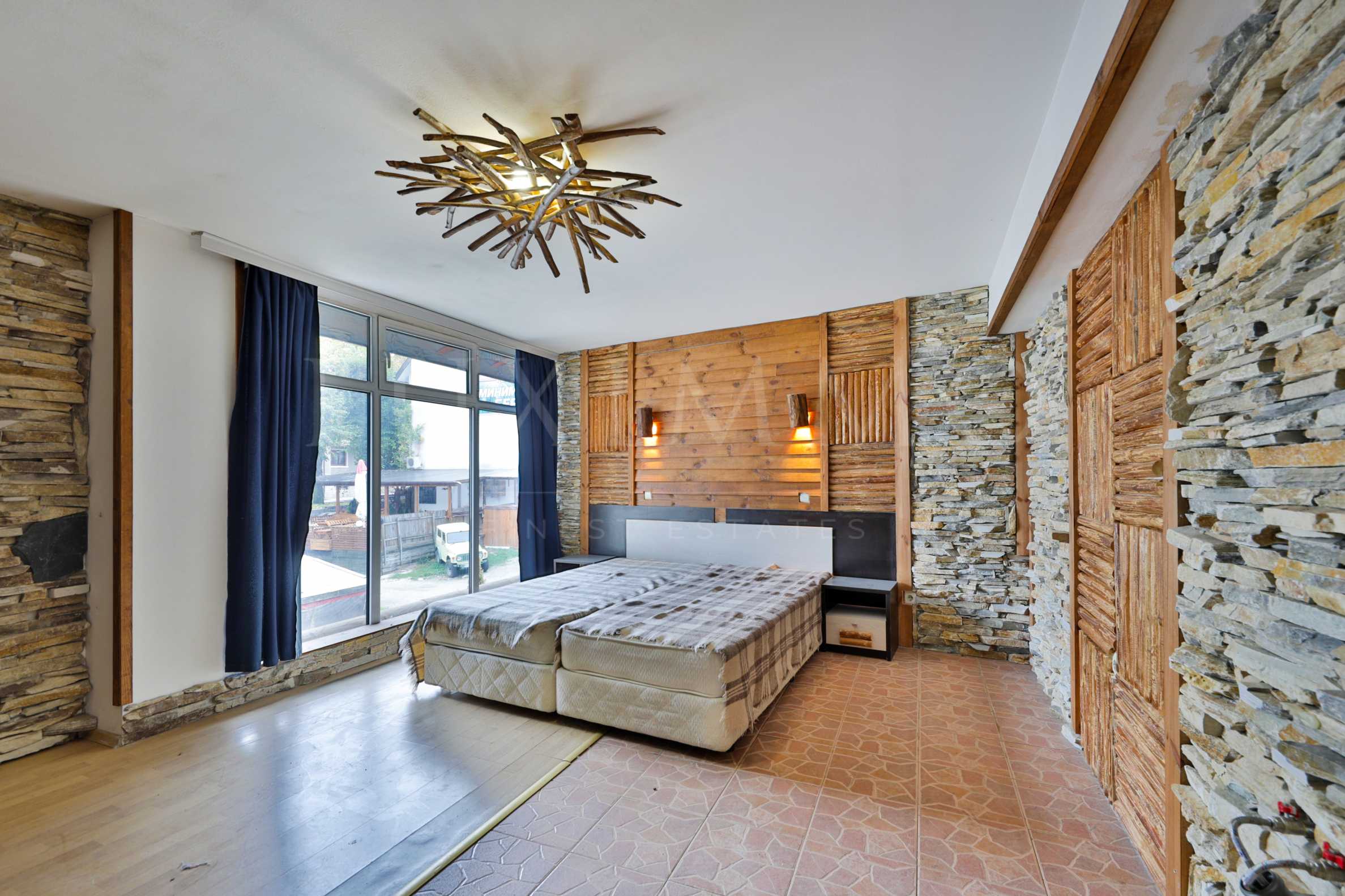 Подовите настилки са с ламиниран паркет и теракот, дограмите са алуминиеви, а стените са оформени с дърво и камък.