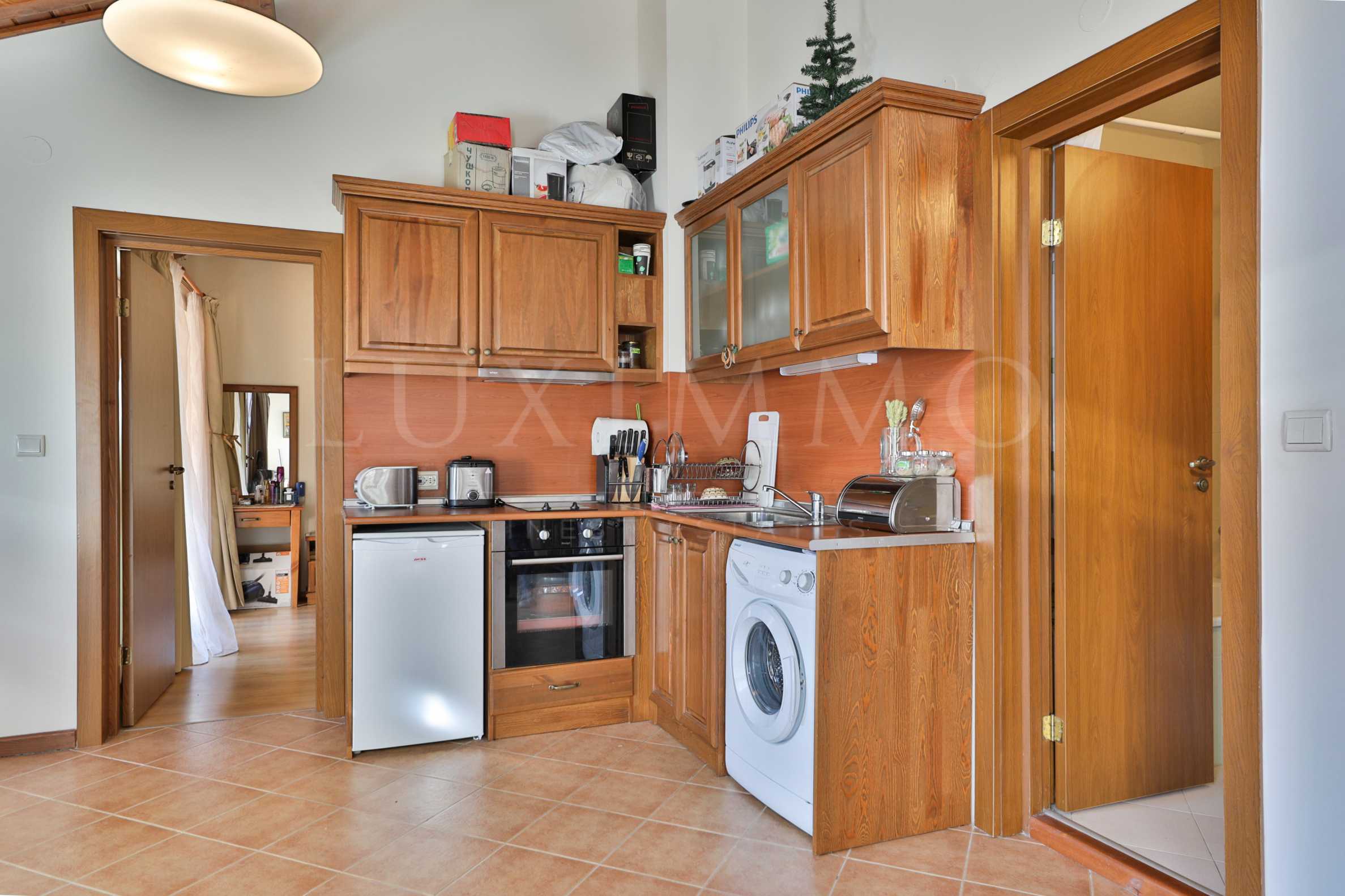 Апартаментът е разположен на четвърти етаж с обща площ от 83.80 кв.м ,чиста площ от 75.40 кв.м, южно изложение. Жилищната площ се разпределя между дневна с кухненски бокс, спалня, баня с тоалетна и вана, две тераси с гледка към планината и вътрешния двор с басейн. Модерно оборудваната кухня включва печка, аспиратор, мивка, хладилник, тостер, пералня; останалото обзавеждане - гардероб, диван и фотьйол, телевизор,трапезарна маса, 4 стола за хранене, спалня, нощни шкафчета, тоалетка с огледало. Апартаментът е снабден е с телефон, кабелна телевизия, интернет и СОТ.
