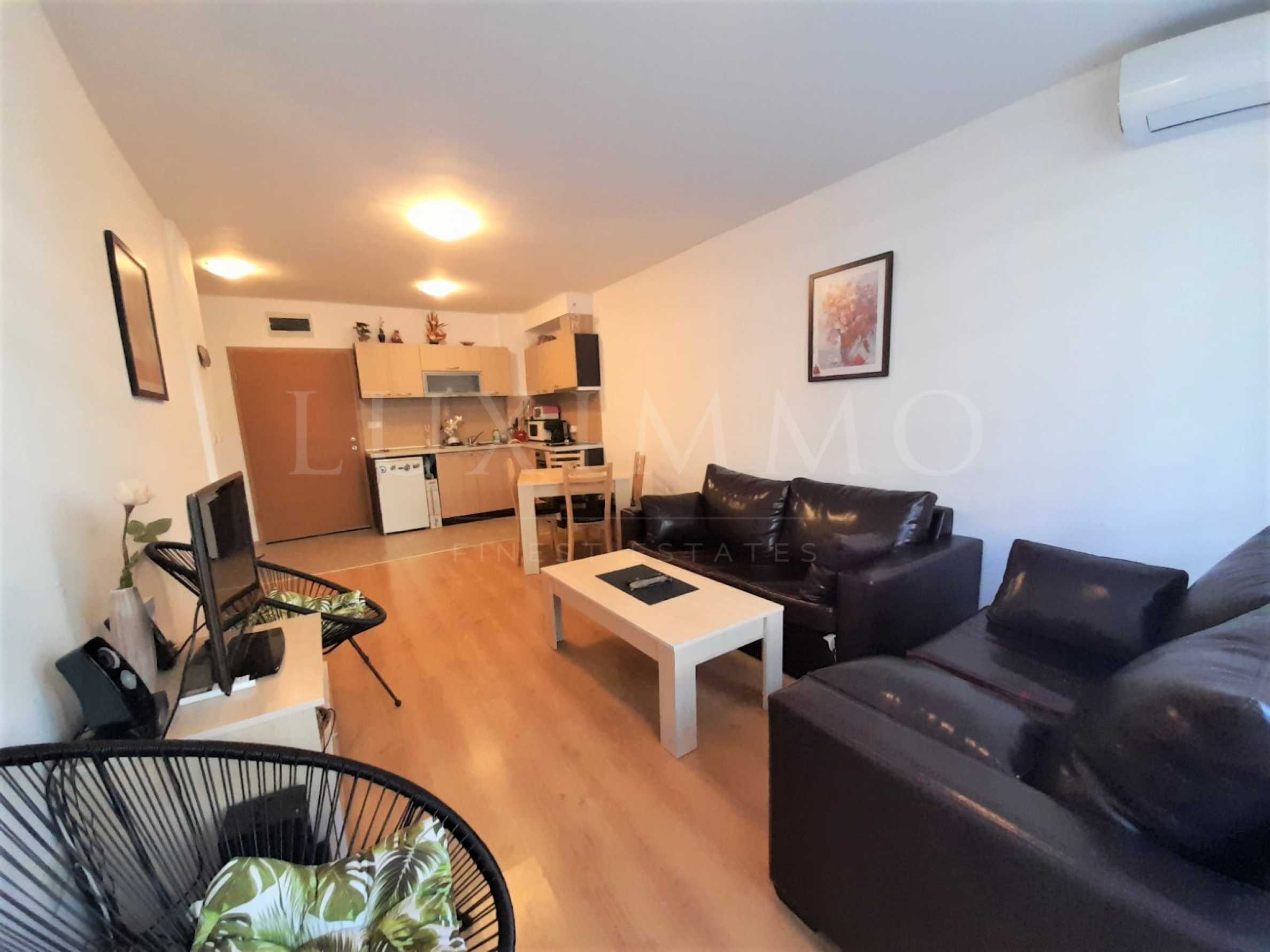 Предлагаме двустаен апартамент с обща площ 65 кв.м. Имотът е в близост до голф игрище и е разположен в целогодишно работещ комплекс. Апартаментът е напълно обзаведен и се състои от: коридор, кухня с хол, една спалня, балкон, баня с тоалетна. Кухнята разполага с: печка, хладилник, маса за хранене. Спалнята е просторна, уютна и обзаведена с двойно легло, гардероб, нощни шкафчета. Холът е обзаведен с: диван, малка масичка, телевизор. Банята се състои от: вана, толетна, мивка, огледало, бойлер и душ.