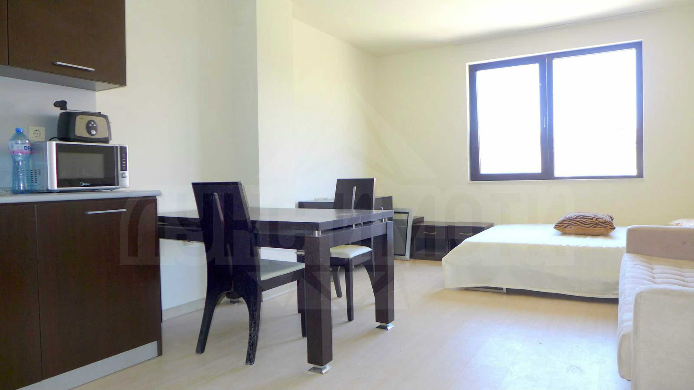 Студиото е с площ от 40 кв.м. и в него могат да се настанят от 2 до 4 човека. Продава се напълно мебелирано и завършено. Подът е ламинат, банята е облицована с фаянс и теракота, на прозорците е сложена PVC дограма. Изложението на имота е западно. Сграда разполага с локално парно и външна изолация.