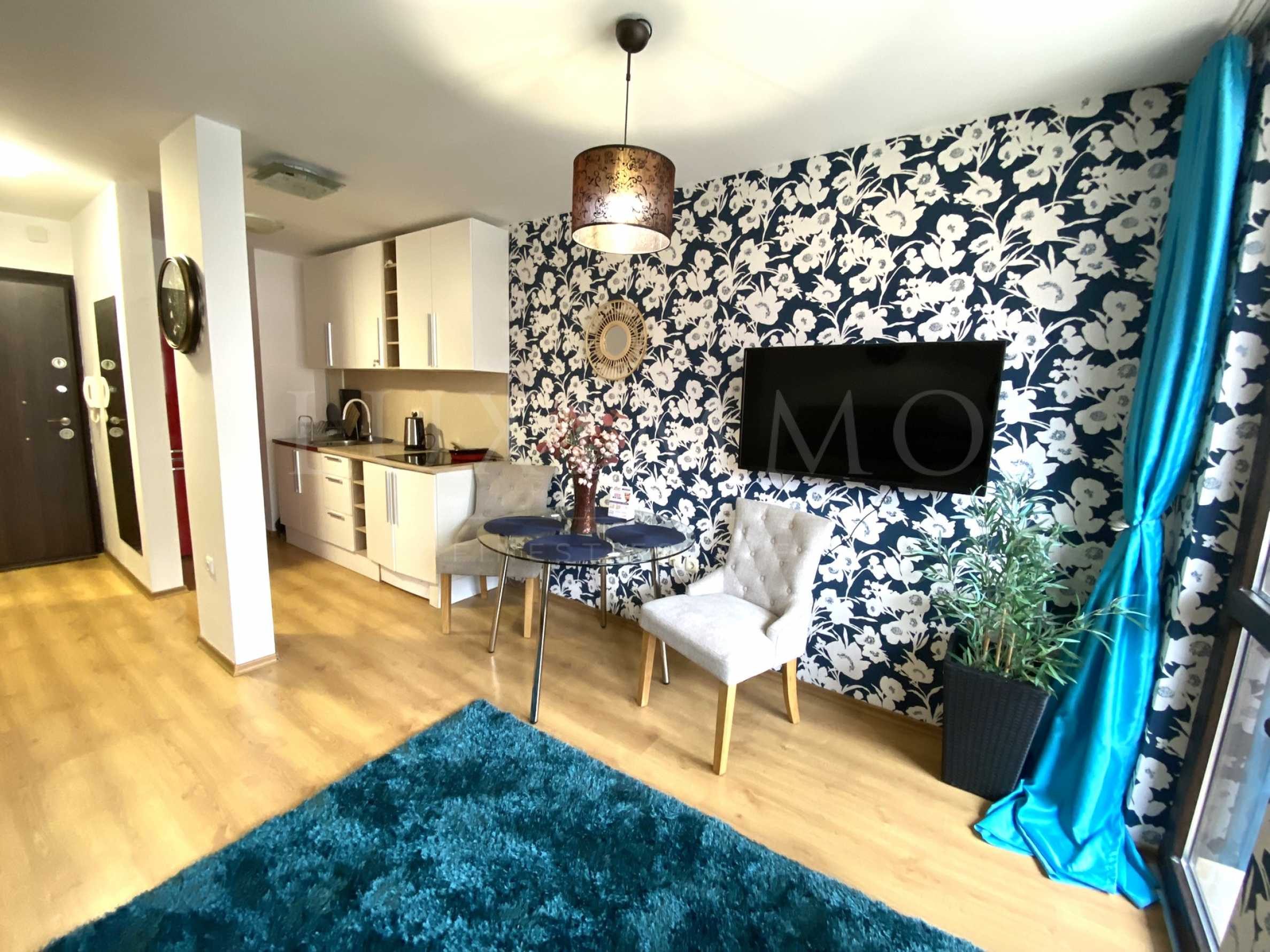 Студиото е ситуирано от: коридор, просторен хол с ъглов диван, холна маса, маса за хранене, телевизор, кухненски бокс, балкон, баня/ тоалетна.