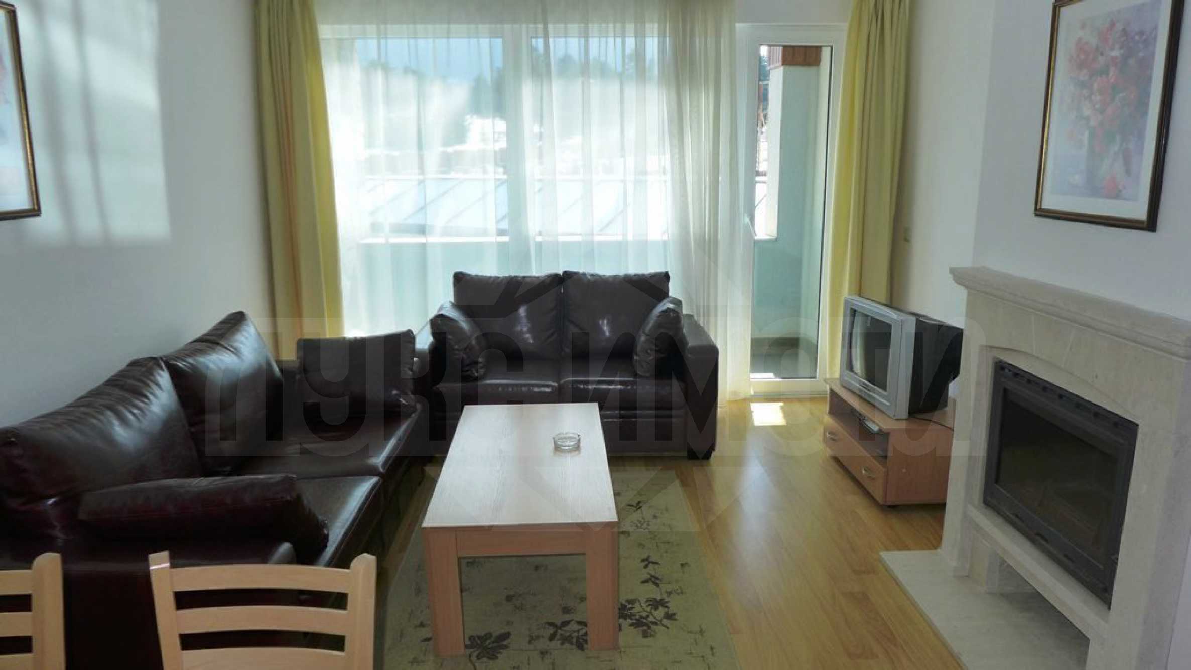 Големият южен апартамент (обща площ от 100.10 кв.м., чиста площ – 87.29 кв.м.) с 2 спални, 2 бани с тоалетна, 2 панорамни балкона и хол с кухненски бокс се предлага напълно обзаведен и оборудван. Крайната цена включва модерна кухня с фурна, двоен котлон, абсорбатор, хладилник, мивка, електрическа кана, тостер; дневна с троен разтегателен диван, двоен разтегателен диван, масичка за кафе, телевизор, DVD плейър, маса за хранене и 6 стола, камина; спалня 1 с двойно легло, 2 нощни шкафчета, двоен гардероб, скрин; спалня 2 - 2 единични легла, 2 нощни шкафчета, скрин; коридор - закачалка и домофон; баня с тоалетна 1 - с вана, мивка, огледало, бойлер; баня с тоалетна 2 – мивка и огледало. Двата балкона разкриват живописна гледка към планини и гори. Апартаментът се продава завършен със стени с латекс, под - ламинат и гранитогрес в коридора и кухнята и ПВЦ дограми. Отоплението е чрез камина и електрически радиатори, разполага с телефон, кабелна телевизия, интернет.
