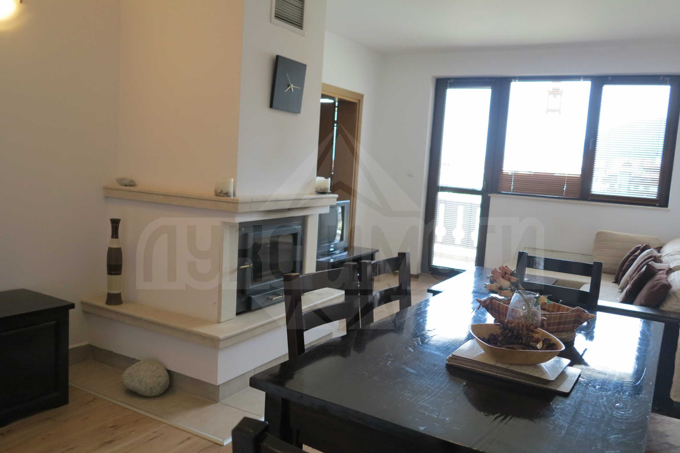 Апартаментът се характеризира с обща площ от 96 кв.м., и източно/западно изложение. Състои се от хол, самостоятелна кухня, две спални, две бани с тоалетни и балкон с красива гледка към съседния комплекс и част от планината. Помещенията са завършени със стени - латекс, подове -ламинат и теракот, ПВЦ дограми. Имотът се продава напълно обзаведен и оборудван. Отоплението е на електричество с конвектори.. Имотът разполага с телефон, кабелна телевизия и интернет. Сградата е снабдена с портиер, 24-часова рецепция и охрана.