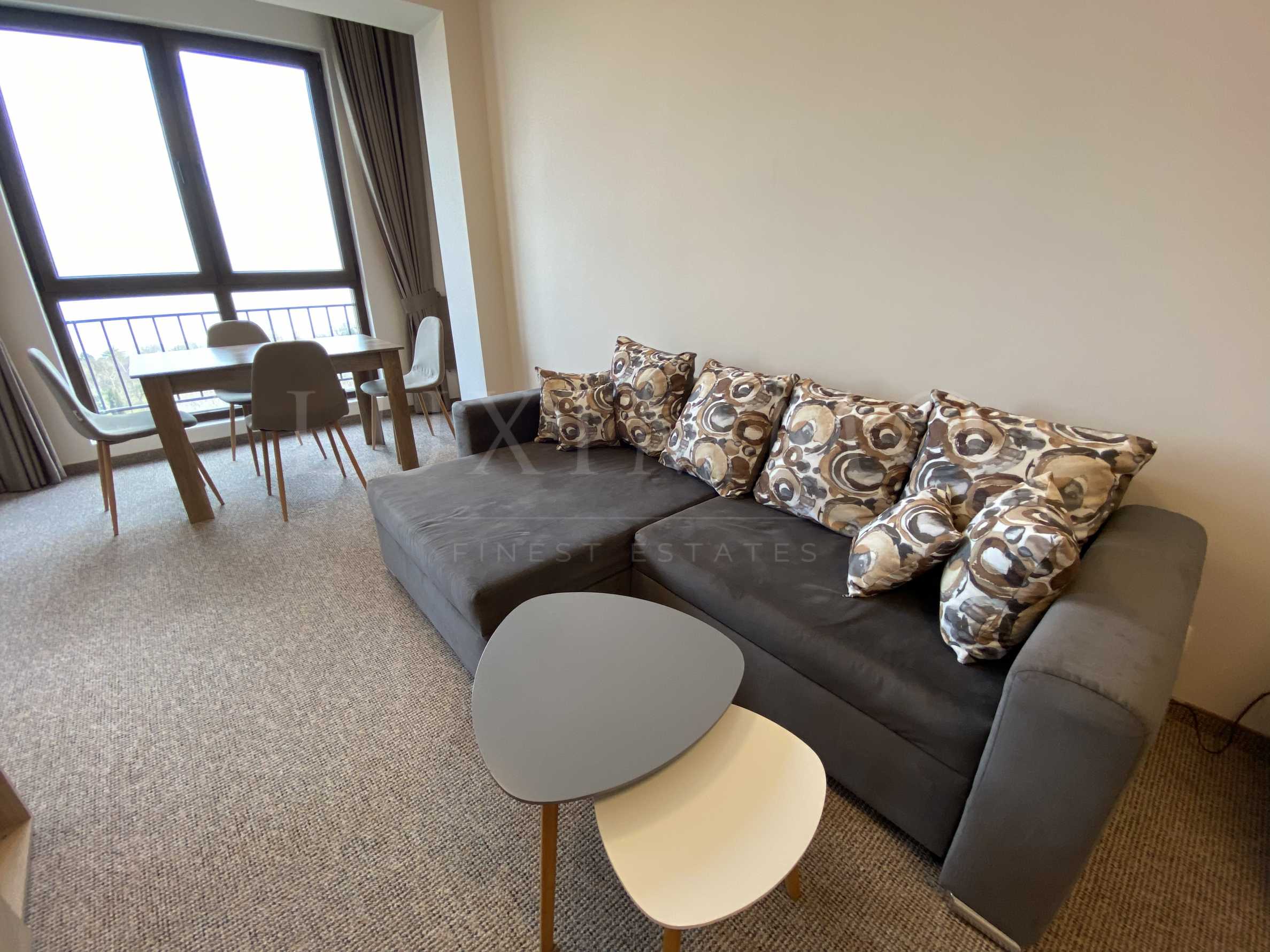 Апартаментът е съвременно обзаведен, има тераса и гледка към морето, езерото и парка. Имотът е разположен на 8-и етаж на сградата с функционално разпределение, изцяло ново обзавеждане. Апартаментът е с качествени довършителни работи, с настилка от мокет, допринасящ топлина и изключителен уют. Отдава се дългосрочно.
