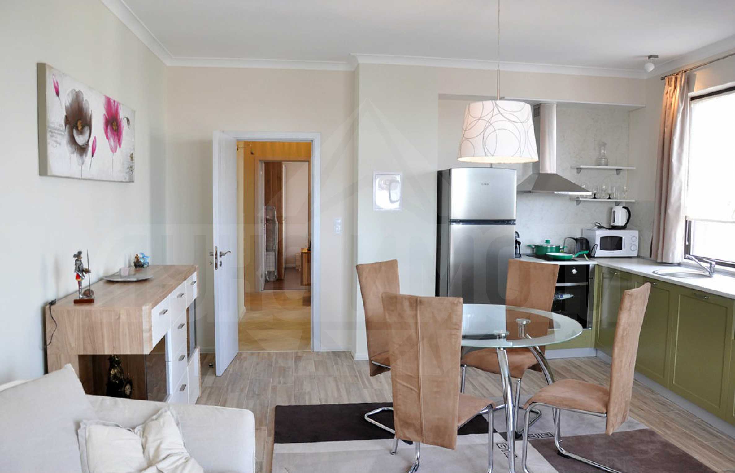 Жилището е с обща площ 85.33 кв.м., разпределени между хол с кухня, две спални, баня с тоалетна и душ кабина, два балкона. Подовите настилки са с паркет и теракот. Кухнята е оборудвана с фурна, ел. котлони, аспиратор, микровълнова печка, хладилник, маса, столове; хол - с 2 дивана, маса, секция, ТВ; спалня 1 - легло, гардероб, нощни шкафчета, скрин, ТВ; спалня 2 - легло, гардероб, бюро, столове. Отоплението е с климатици. Пълното обзавеждане и оборудване може да разгледате на снимките.