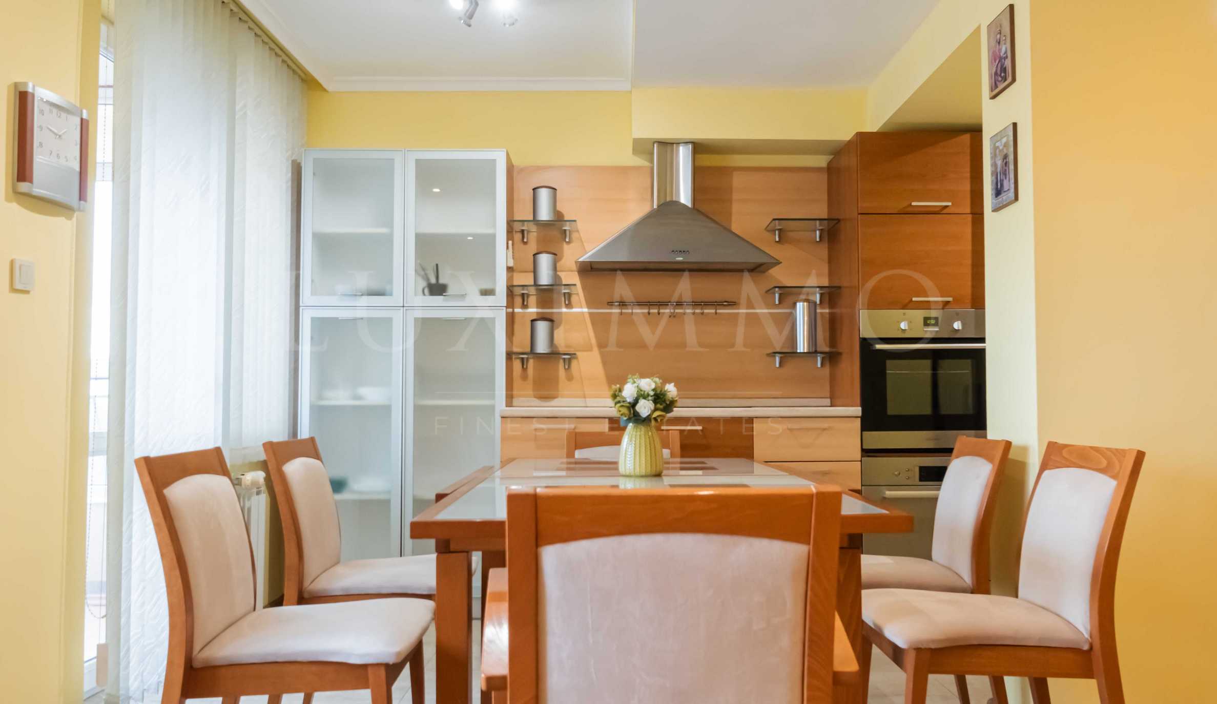 Апартаментът се намира на 4-ти етаж от общо 6, в нова сграда с асансьор, с изложение изток-запад. Предлага се с качествени мебели и уреди, обзаведен с вкус и стил.
