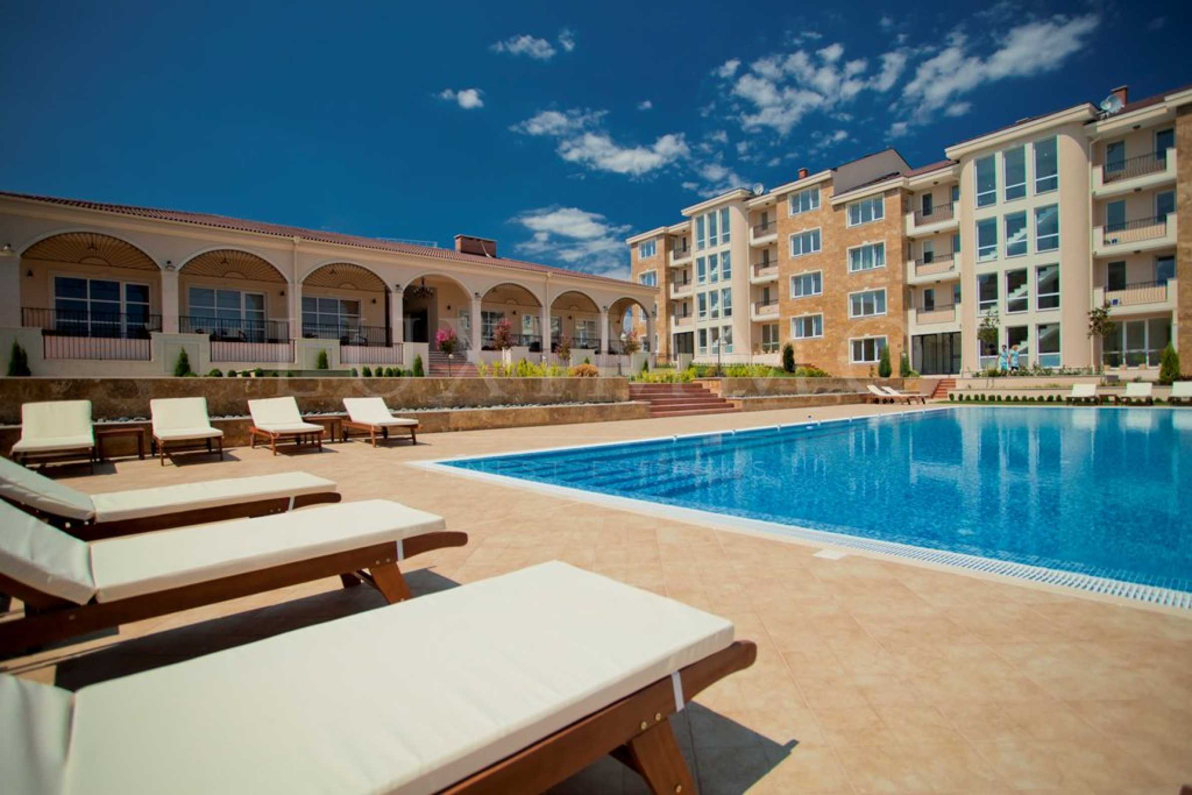 На територията на комплекса има красива градина и басейн, детска площадка, ресторант, минимаркет и открит паркинг.