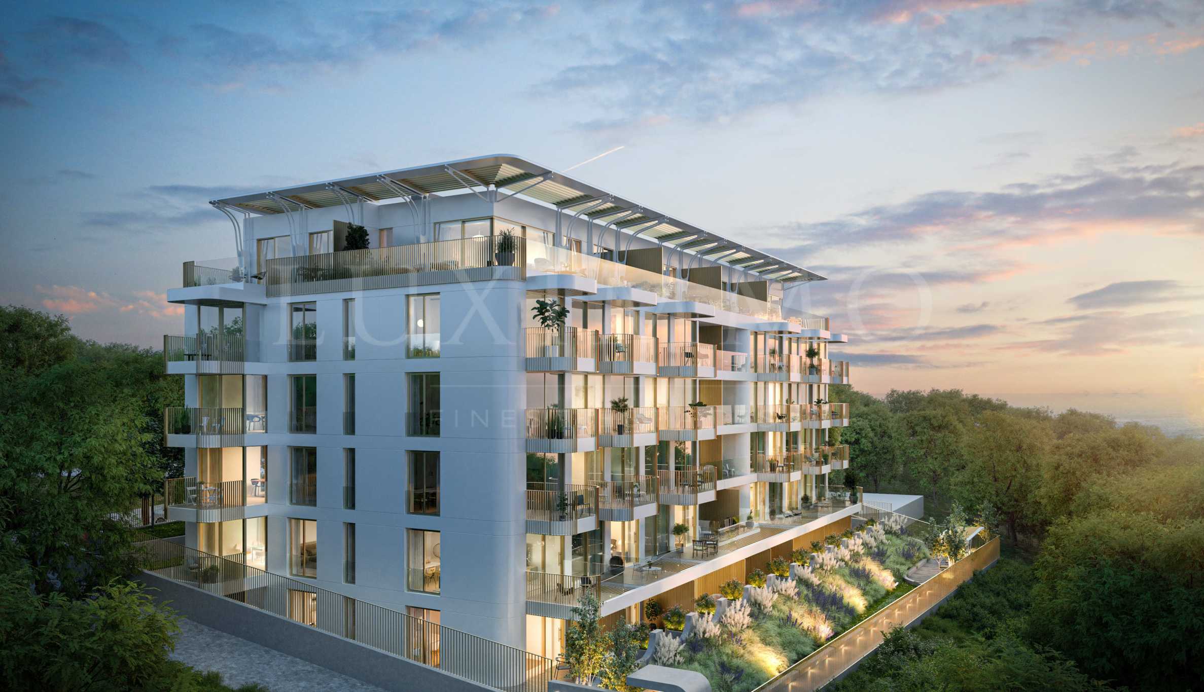 За апартаментите на първите две нива са предвидени дворни пространства: самостоятелни дворове към всички приземни апартаменти на ниво сутерен; дворните пространства и към четири от апартаментите на ниво партер. Жилищата на по-високите нива са решени с големи плъзгащи се витрини и просторни тераси със стъклени парапети, повечето от които с гледка към морето.