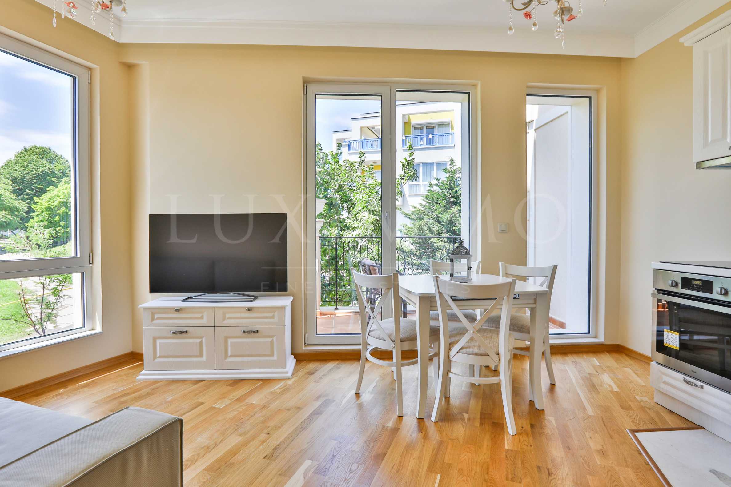 Апартаментът е комфортно обзаведен, с най-висок клас довършителни работи и оборудването, което допринася за най-комфортното пребиваване и отдих на метри от пясъчния плаж. Имотът предлага съвременен интериор в светли тонове, оборудвана кухня с електроуреди, мебели за съхранение и релакс, луксозна баня и обширна тераса с приятна гледка към зеленината.