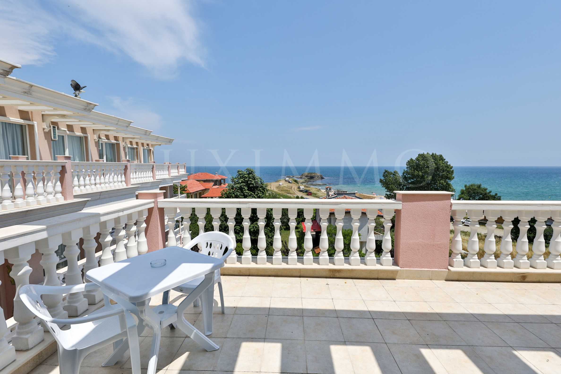Апартаментът притежава панорамна тераса от 13.28 кв.м, с гледка към морето, басейна и плажа.