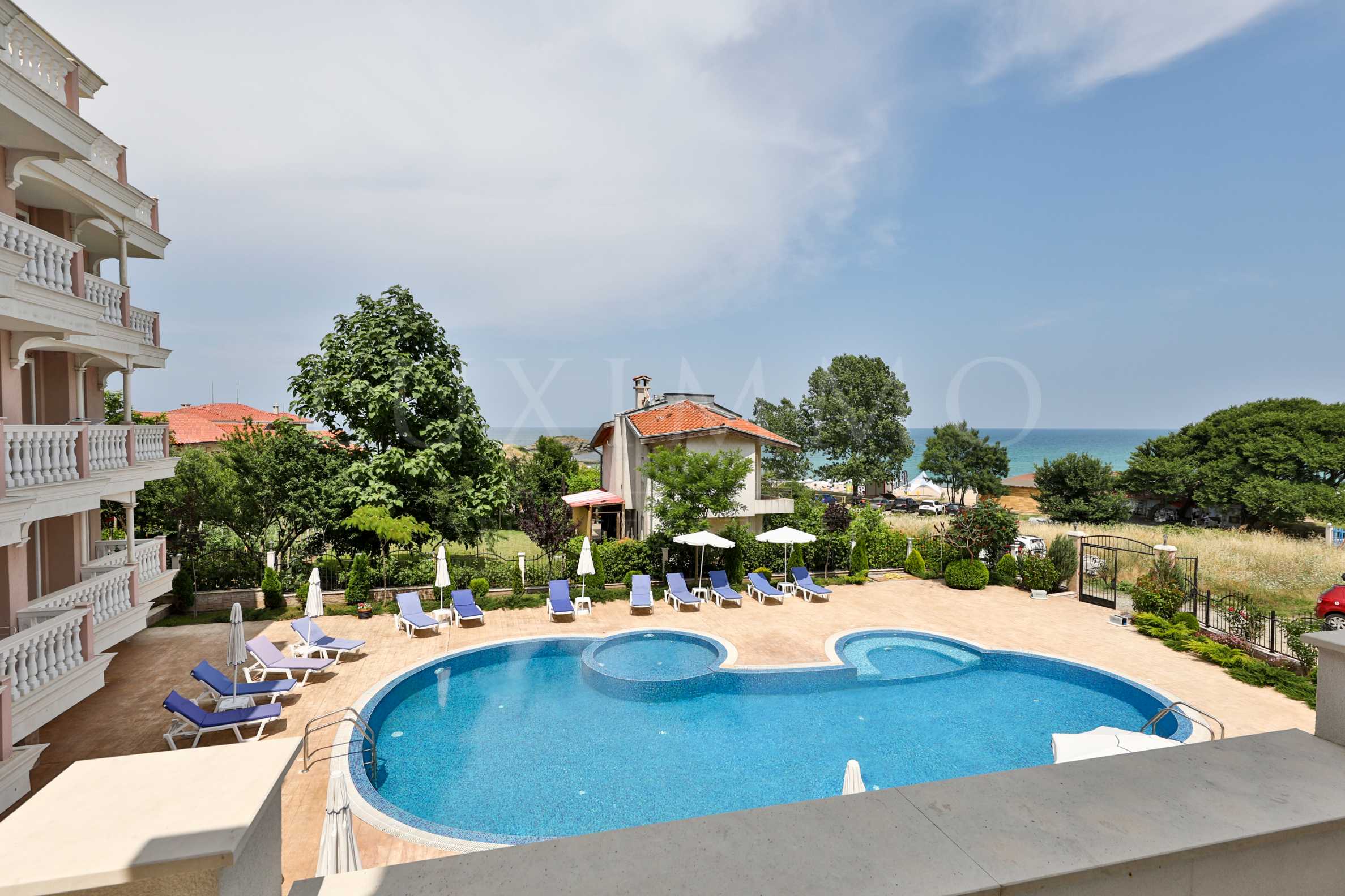 Сградата се откроява с изискана и елегантна архитектура, с просторни тераси с балюстри. Ориентирана е към морския бряг и предлага невероятни гледки към морето и плажа. Има всички необходими за приятната почивка удобства на територията: басейн, подземен паркинг и ресторант, охрана, видеонаблюдение и рецепция.