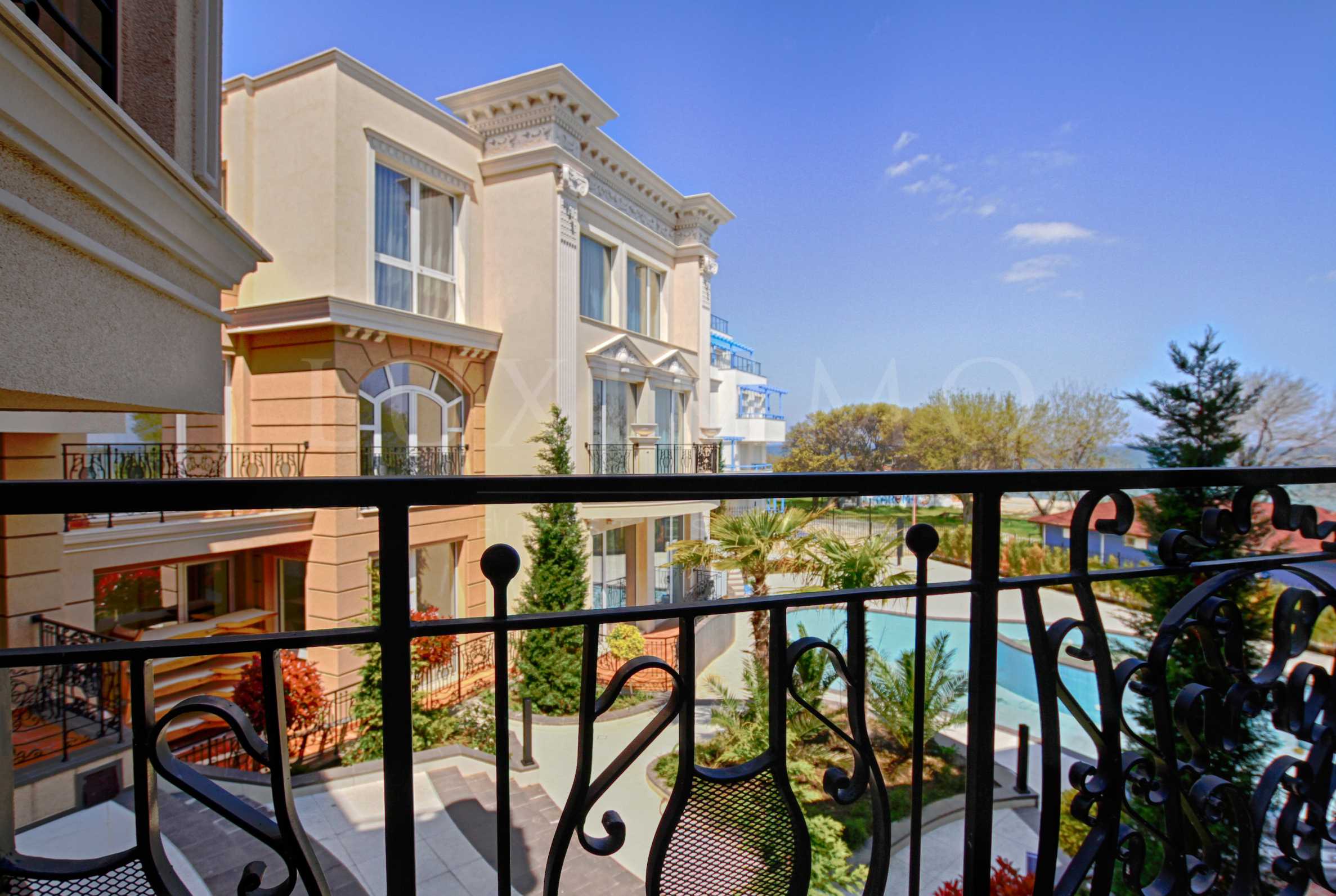 Студиото е разположено на 2-ри етаж и има обща площ 59.91 кв.м. Имотът е напълно обзаведен, с най-висок клас довършителни работи и оборудването, което допринася за най-комфортното пребиваване и отдих на метри от пясъчния плаж. Предлага отделна зона-спалня и уютна тераса с приятни гледки към вътрешния двор, красив басейн, морето и плажа.