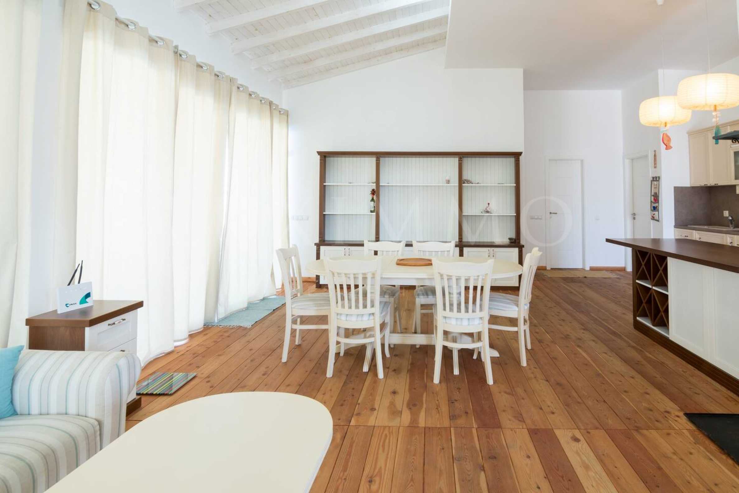 Интериорът е решен в светло, с морски акценти, с уютна камина и бели греди на тавана в дневната, с приятни класически мебели в пастелни и бели тонове, в съчетание с качествени съвременни електроуреди и атрактивно осветление.