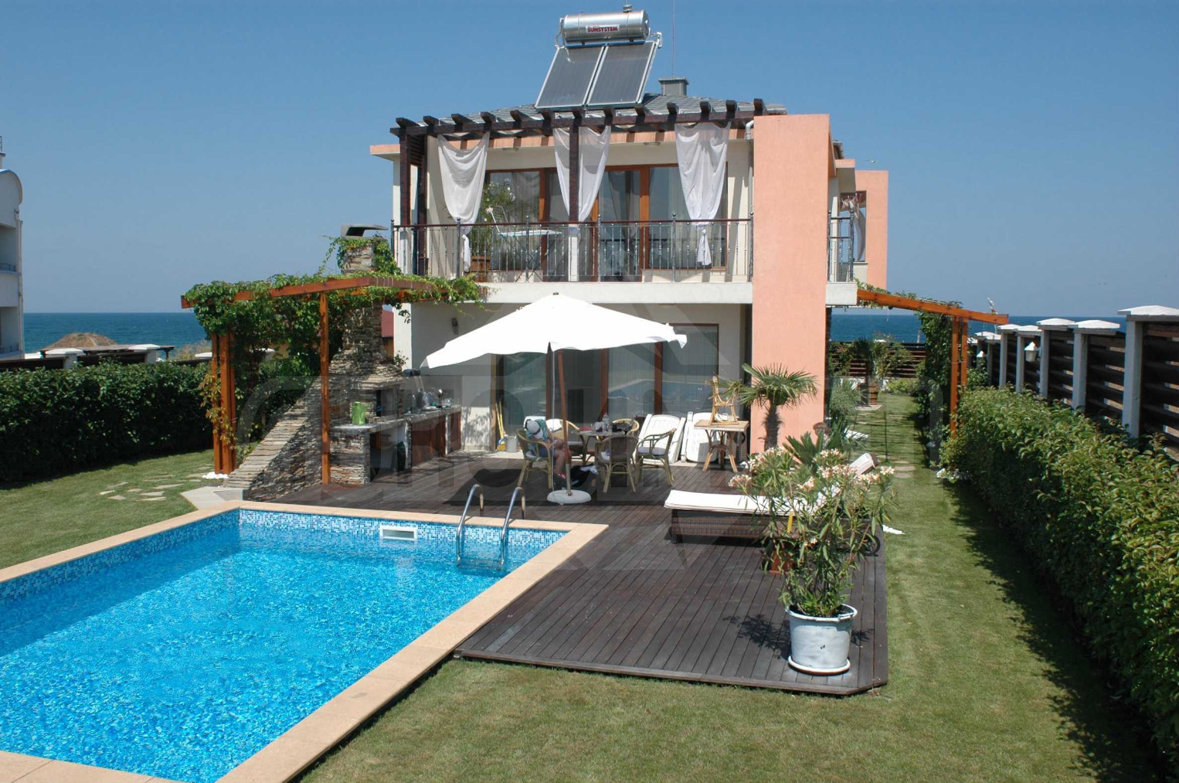 Предлагаме на вашето внимание уникална ваканционна къща в срезидемноморски стил. Къщата е разположена на първа линия на морето, само на 50 м от него. С басейн и настилки от екзотична дървесина. Има зидано барбекю в поддържания двор, който е с площ 550 кв. м.