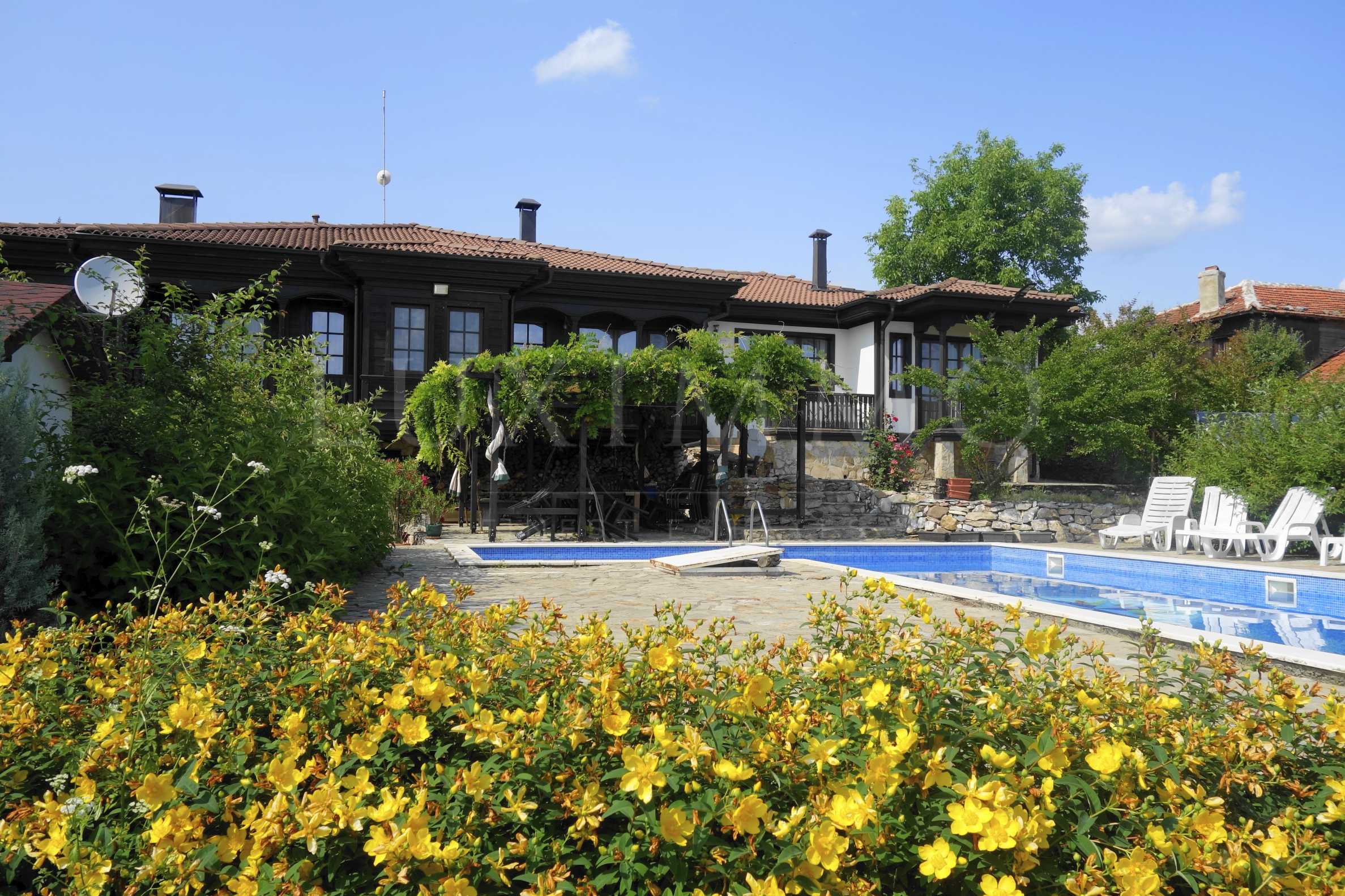 Имотът е с обща площ от 274,20 кв.м, красиво озеленен двор от 348,40 кв.м, басейн и спираща дъха панорамна гледка към хълмовете на планината.