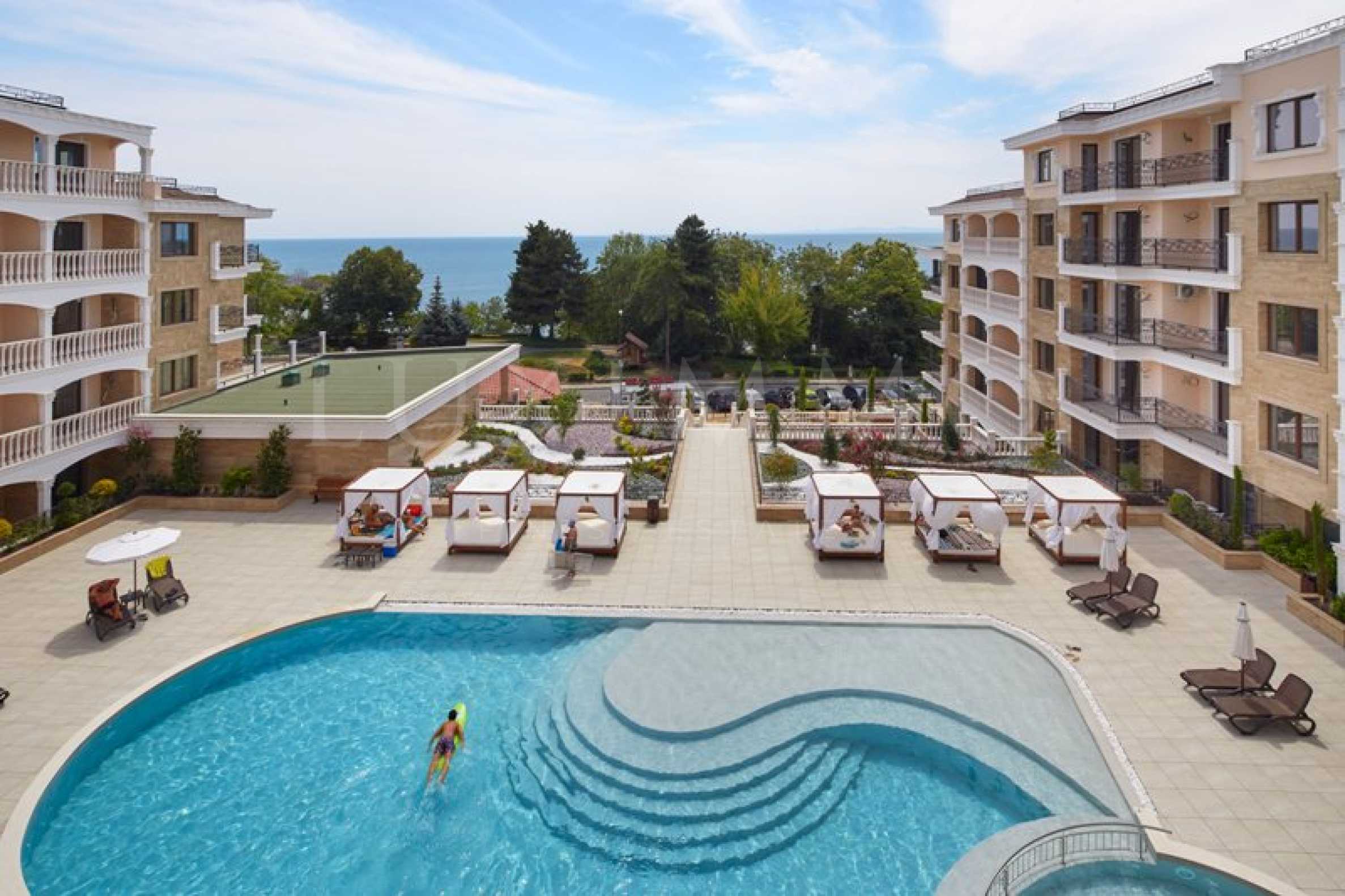 Разположен в южната част на популярния курорт, отличителният комплекс се откроява с изтънчена, съвременна архитектура, с класически средиземноморски нотки - естествен камък, ковани елементи и балюстри, в съчетание с богато озеленяване както на самата територия, така и на покривната част на сградата. Стратегическата локация на брега на морето осигурява забележителна, фронтална гледка към морето целогодишно, а близостта към градския парк прави този комплекс идеален за семейно обитаване и комфортен отдих с деца.