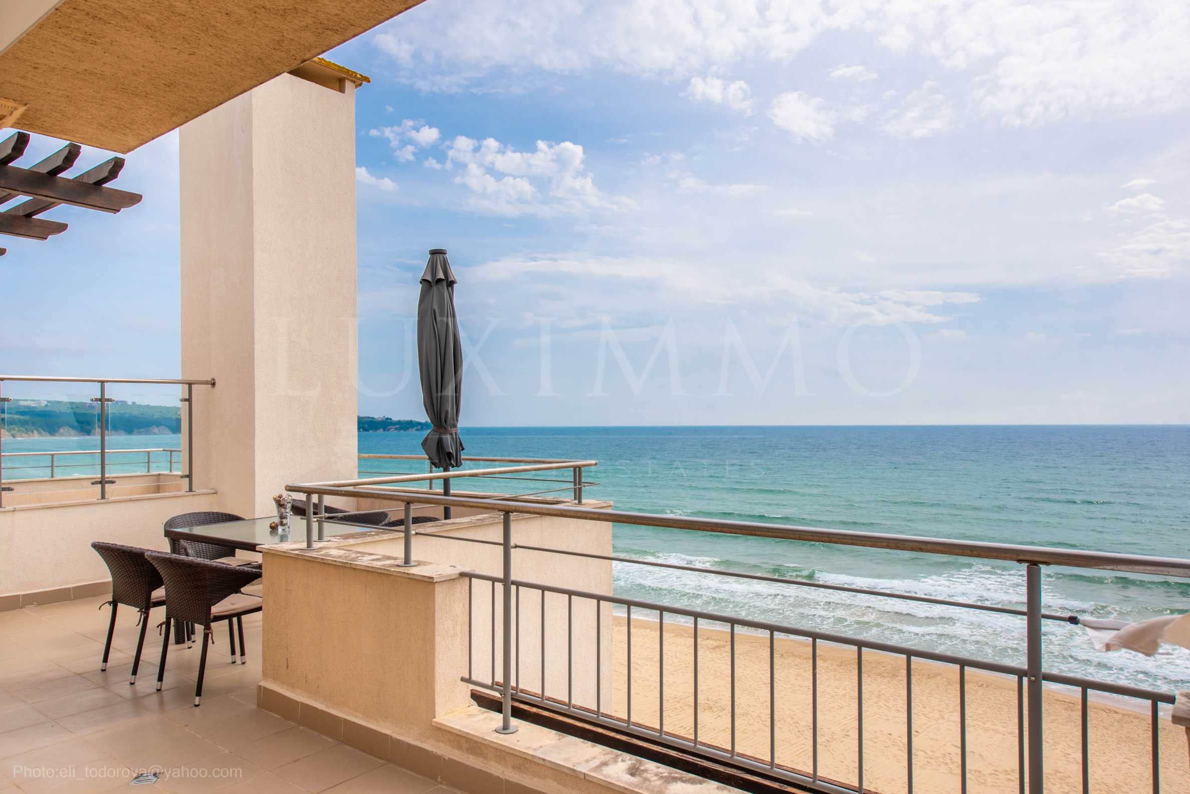 Апартаментът се намира на пети, последен етаж и има фронтална панорама към морето и плажната ивица. Жилището разполага с впечатляваща тераса от цели 36 кв.м, от която се открива панорамна гледка, както към морето и плажа, така и към хълмовете на Стара планина. Квадратурата на имота е 47.10 кв.м жилищна площ и 36 кв.м тераса.