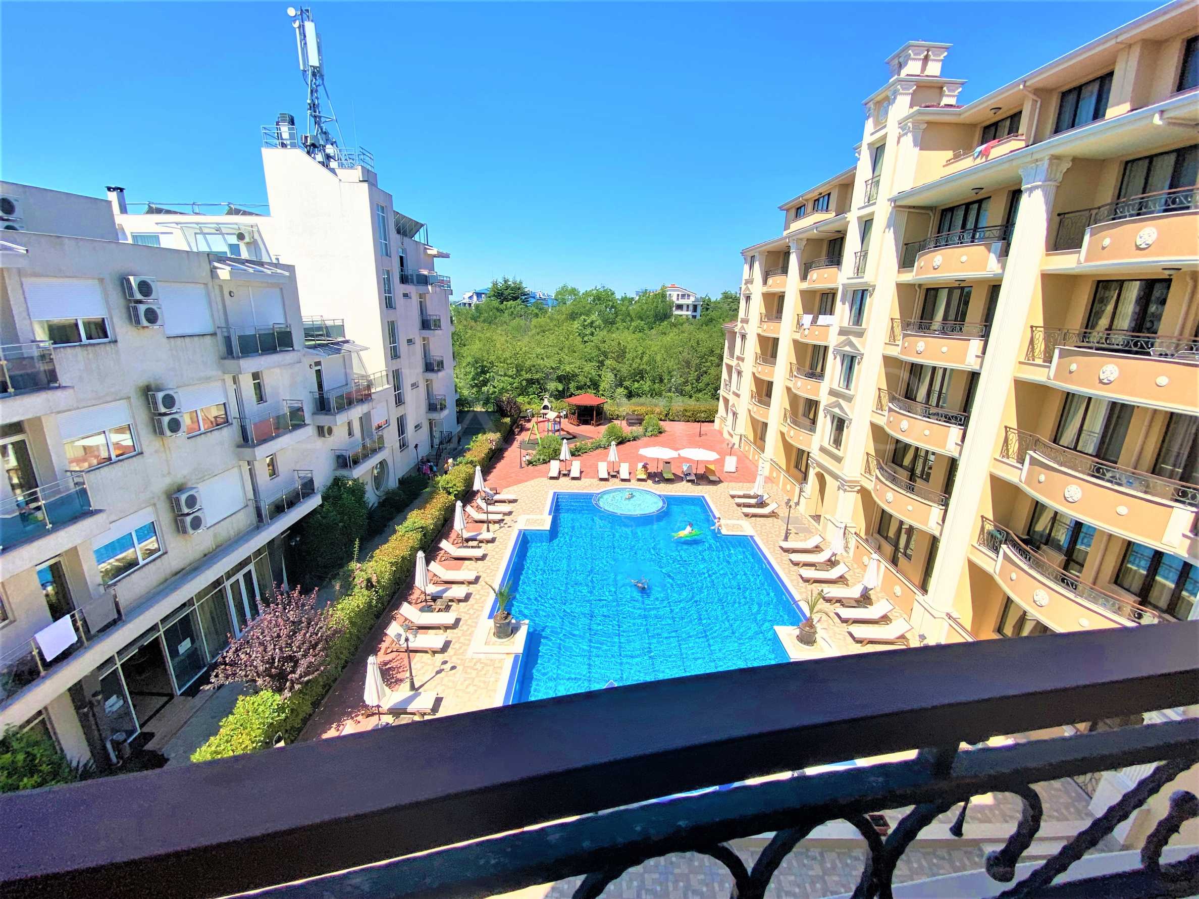 Сградата се откроява с елегантна архитектура, с красив басейн и зона за релакс на територията.