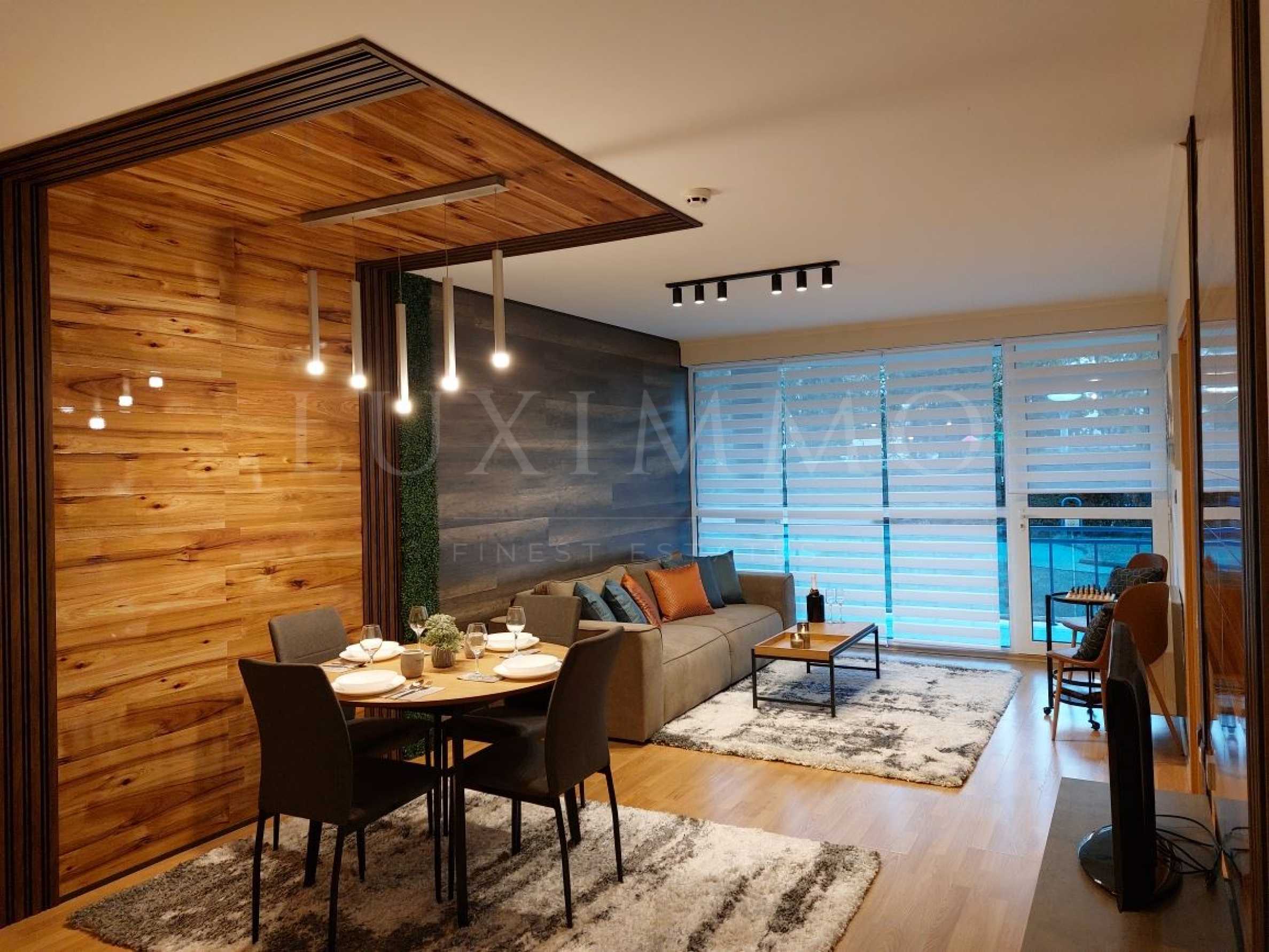 Жилището е напълно обзаведено и оборудвано с всичко необходимо за живеене. Впечатлява с изискан и модерен интериор в светли, пастелни цветове в комбинация с дърво.