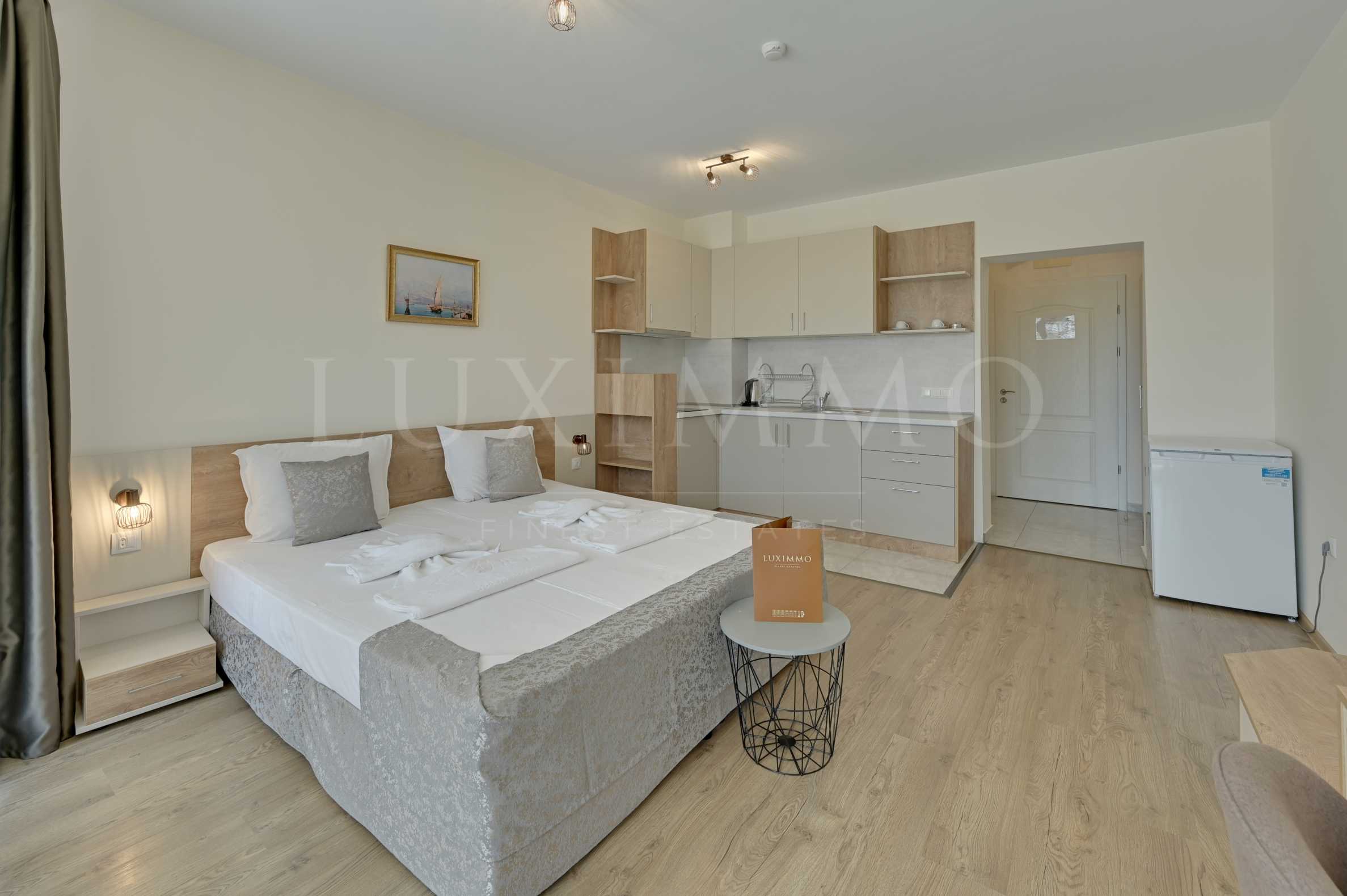 Представяме Ви отлично студио в комплекс с морска гледка, разположено на втори етаж в четиризвездния хотел в гр. Приморско – на първа линия с директен достъп до плажа.