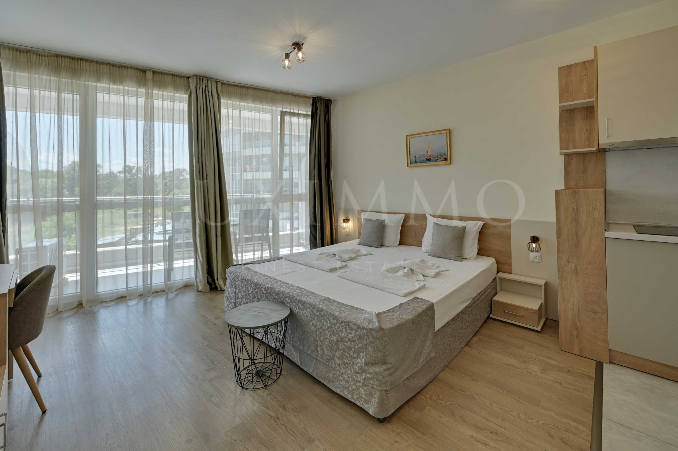 Представяме Ви отлично студио в комплекс с морска гледка, разположено на втори етаж в четиризвездния хотел в гр. Приморско – на първа линия с директен достъп до плажа.