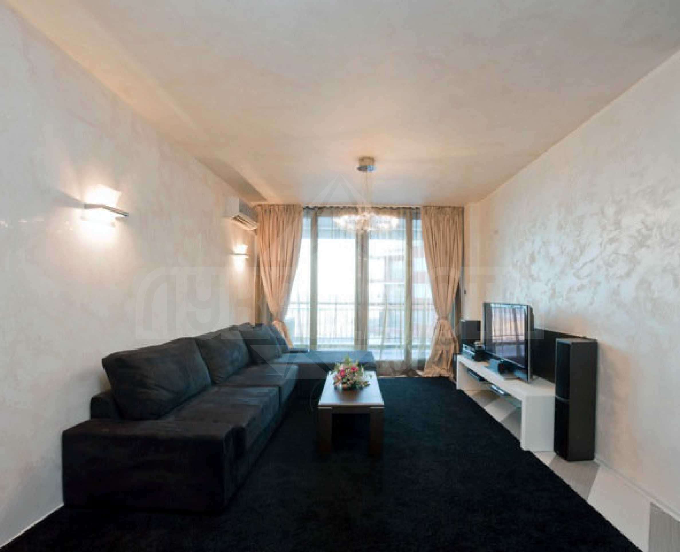 Описваното двустайно жилище с площ от 85 кв.м. се разполага на трети етаж. Стаите са обзаведени с италиански подови настилки, бани и санитария, корпусна мебел от МДФ, дивани, осветителни тела и интериорни врати. Стените са с с венецианска мазилка, дограмата е алуминиева 7-камерна SCHUKO. Подовите настилки са с теракот (кухня), мокет (спалня), ламинат (хол). Удобствата в апартамента включват климатици във всяка стая, кабелна/сателитна телевизия, интернет, комфортни обзавеждане и кухня с вградени уреди. Таксата поддръжка е 10 евро / кв. м. без ДДС.