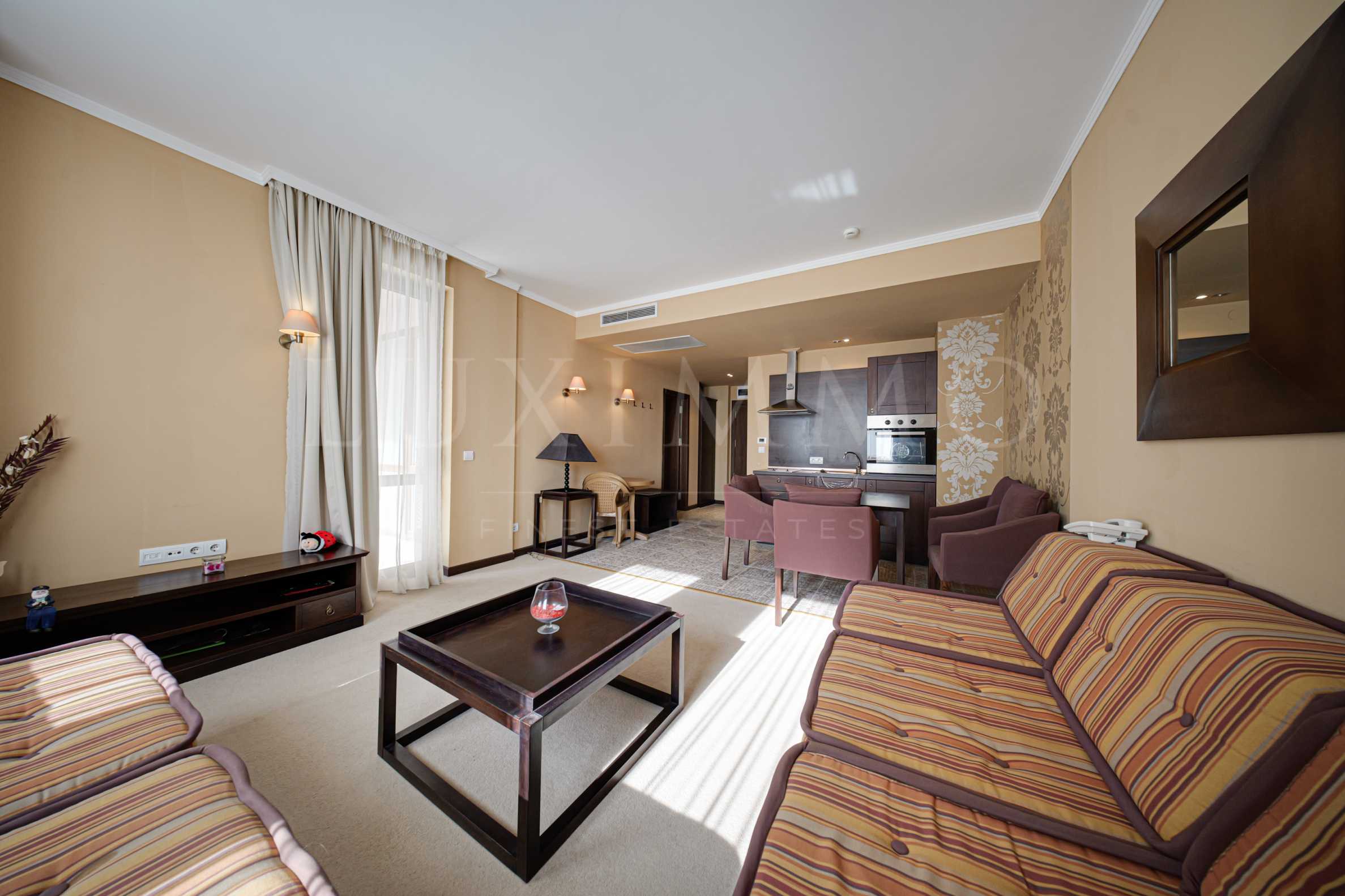 Ексклузивно представяме комфортно мебелиран и готов за нанасяне, двустаен апартамент за продажба, в престижния петзвезден комплекс, само на 50 метра от плажа, в центъра на Слънчев бряг.
