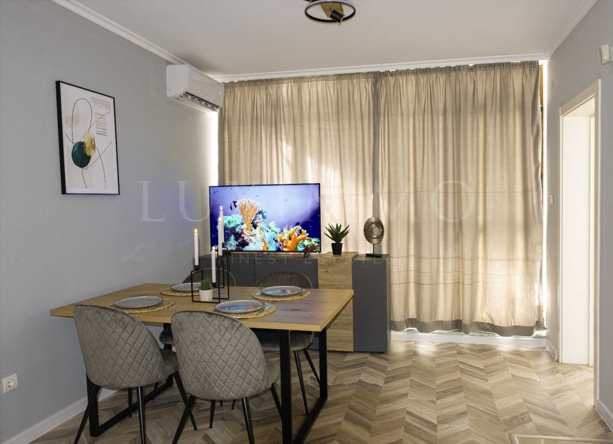 Жилището е напълно обзаведено и оборудвано с всичко необходимо за живеене, продава се с мебели и техника, подходящ вариант е както за лично ползване, така и за инвестиция.