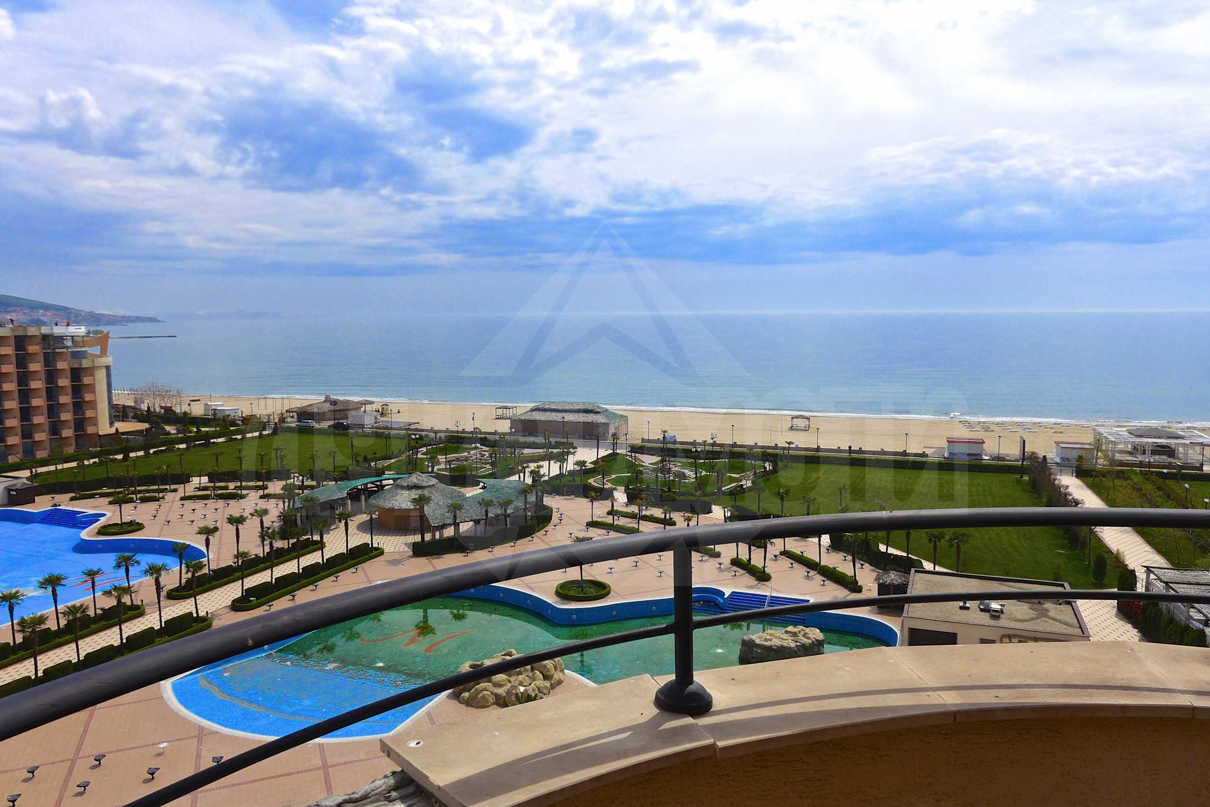 Имаме удоволствието да представим на вашето внимание напълно обзаведен двустаен апартамент, част от елитен затворен комплекс „Маджестик Хотел & Резидънс“, разположен в северната част на Слънчев бряг, на първа линия море (50 метра от плажа). Хотелът e елегантен и модерен, завършен спрямо съвременните архитектурни решения върху парцел от 45 000 кв.м. с красиви градини и басейни и обща разгъната площ от 56 000 кв.м. Отличната локация се допълва от близостта до автобусна спирка – 250 метра и до центъра на морския курорт - 2 км.