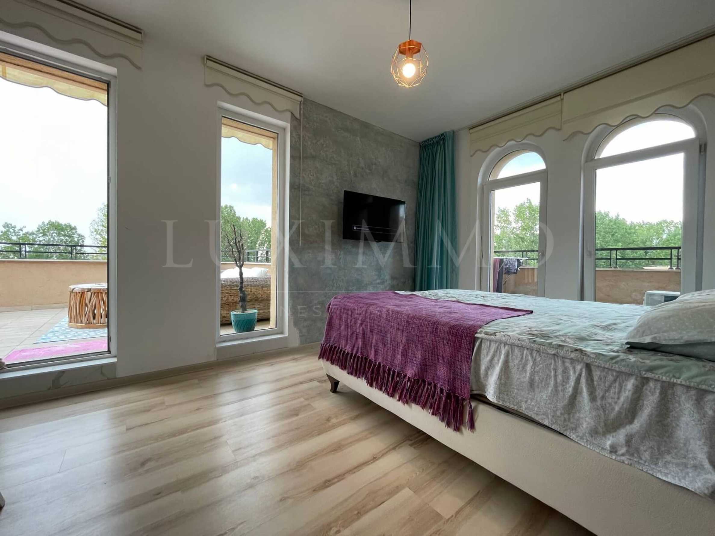 Имотът се намира на 5-и етаж и има обширна тераса с гледка към басейна, отлично оборудвана зона за релакс на открито.