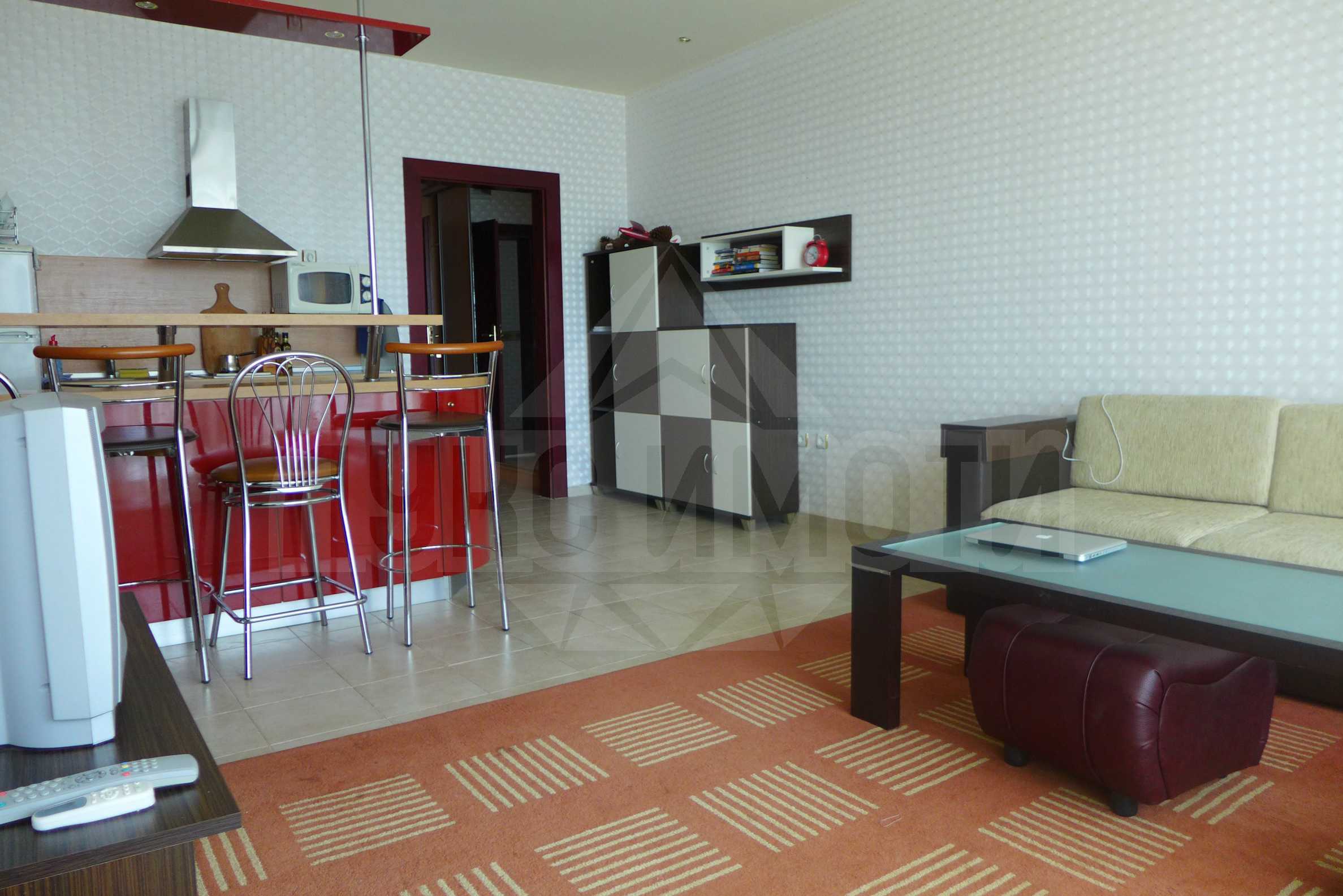 Описваният апартамент с площ от 102.55 кв.м. се състои от две спални, хол с кухненски бокс, две бани с тоалетни и два балкона с приятна гледка към улицата и морето. Помещенията са завършени с подови настилки теракот, стени латекс и ПВЦ дограми. Апартаментът е напълно, луксозно обзаведен, готов за живеене или отдаване под наем. Кухнята е снабдена с котлон, аспиратор, фурна, хладилник, пералня, микровълнова, ТВ сет, маса и столове; едната спалня с гардероб, климатик, тоалетка и спалня; втората спалня – с две легла, гардероб с плъзгащи врати,телевизор; двете бани с тоалетна – с вана и аксесоари.
