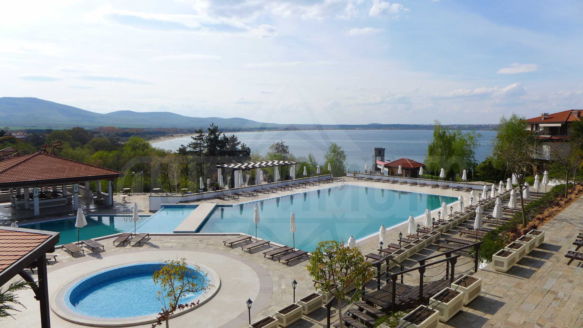 В този прекрасен комплекс, ние предлагаме за продажба обзаведен 2-стаен апартамент, намиращ се на 2 етаж в една от вилите. Апартаментът има площ 76 кв. м и се състои от следното: входно антре, дневна с кухненски бокс, 1 спалня, баня с тоалетна, просторна тераса с гледка към морето. Апартаментът е напълно обзаведен и оборудван, и е готов за живеене или отдаване под наем. Стаите са климатизирани и има маса и столове за терасата. Всички мебели са много стилни и са изработени от масивно дърво.