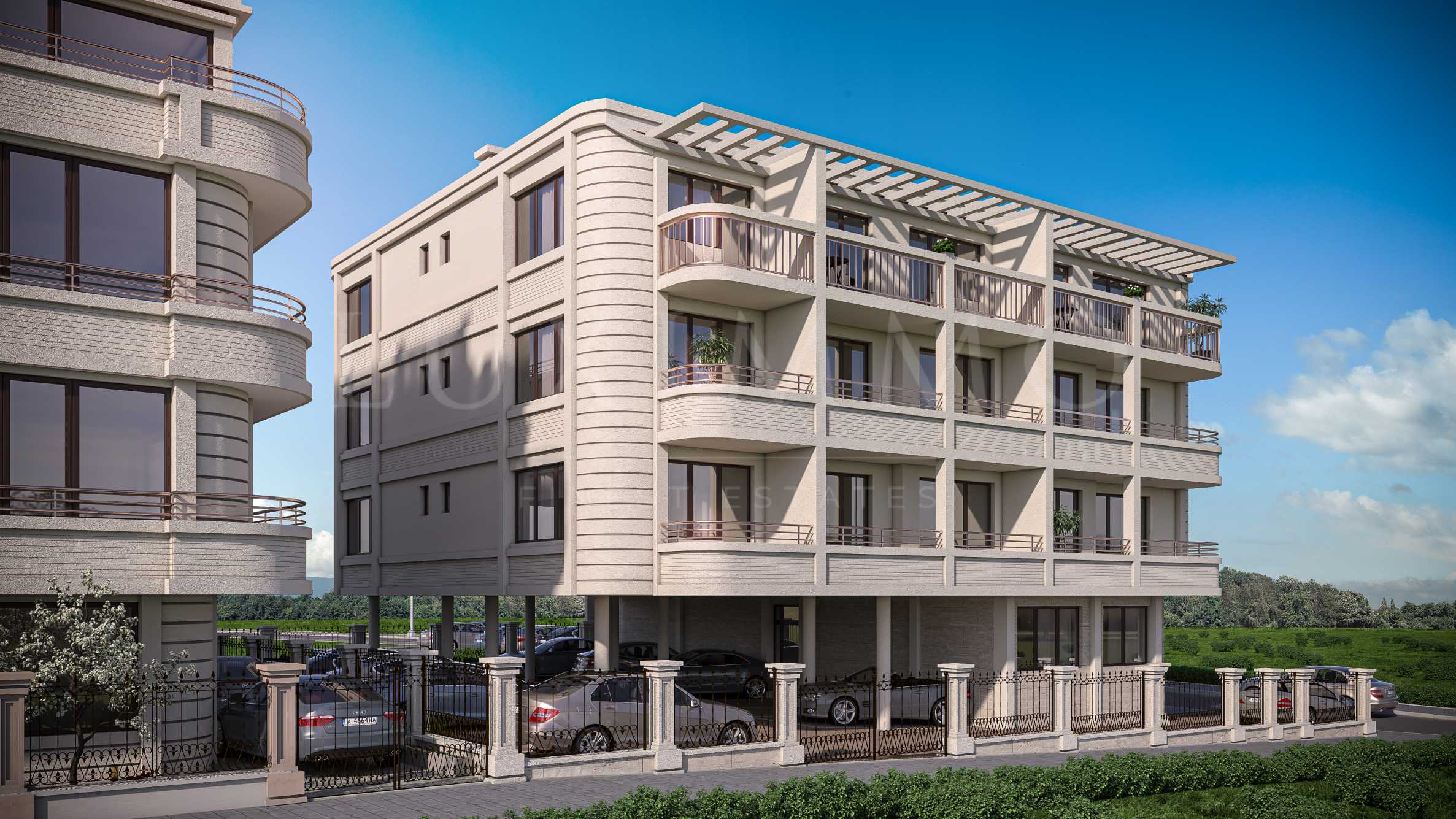 Сградата е проектирана на 4-ри етажа, с паркоместа на открито, разполага с ограничен брой апартаменти на всяко ниво. Фасадата е елегантна и стилна, строителството е от високо качество и напълно съобразено с морския климат. Ще има минимална такса за поддръжка, необходима при жилищна експлоатация.