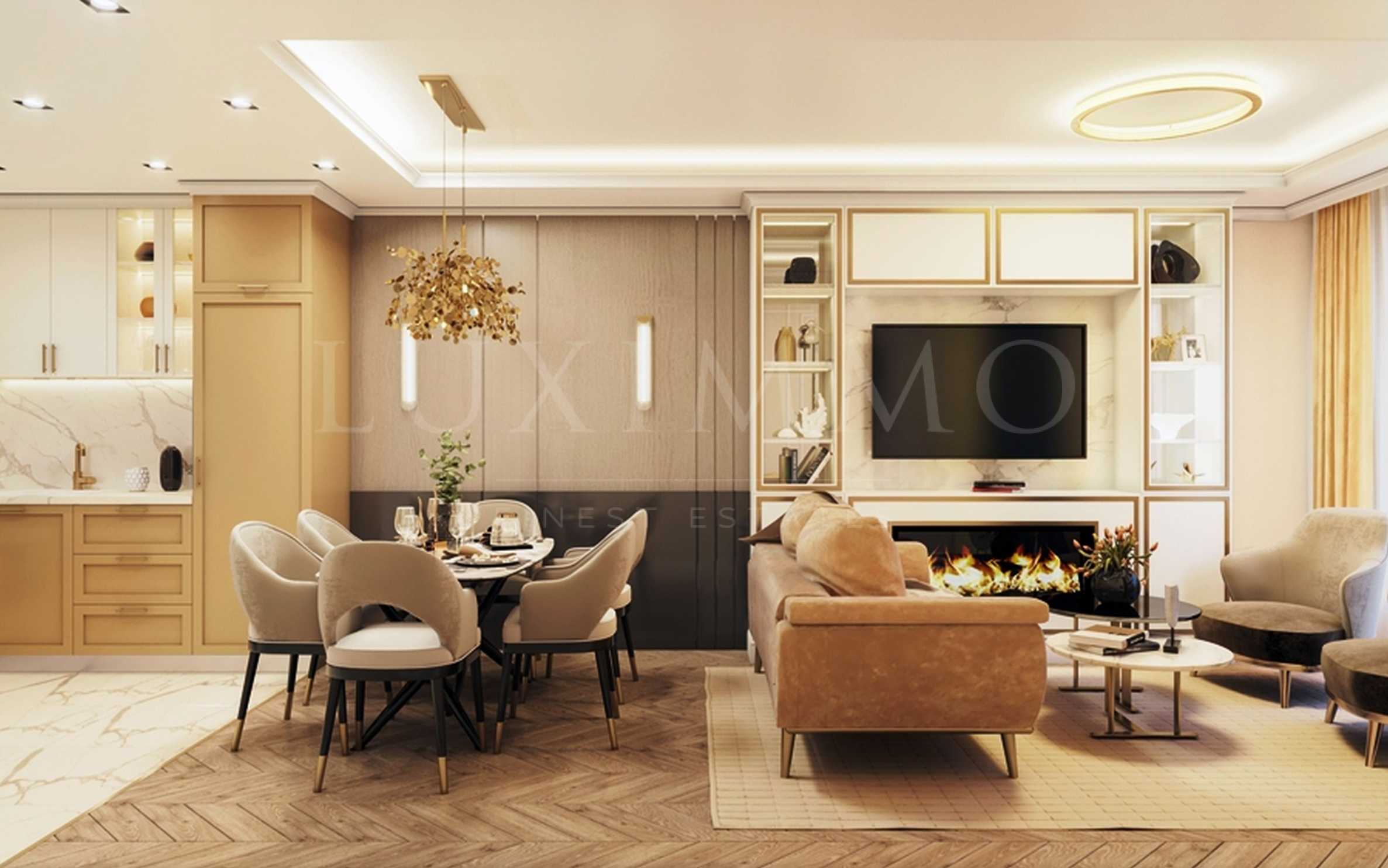 Има възможност за довършването на имотите "до ключ" и с пълно обзавеждане по бутиков дизайнерски проект срещу допълнително заплащане. Проектът се предоставя като бонус, има и варианти за мебелиране. За акцент са използвани син и златно бежов цвят. Банята е в класически стил, с плочки от бежов мрамор, както по снимките към тази оферта.