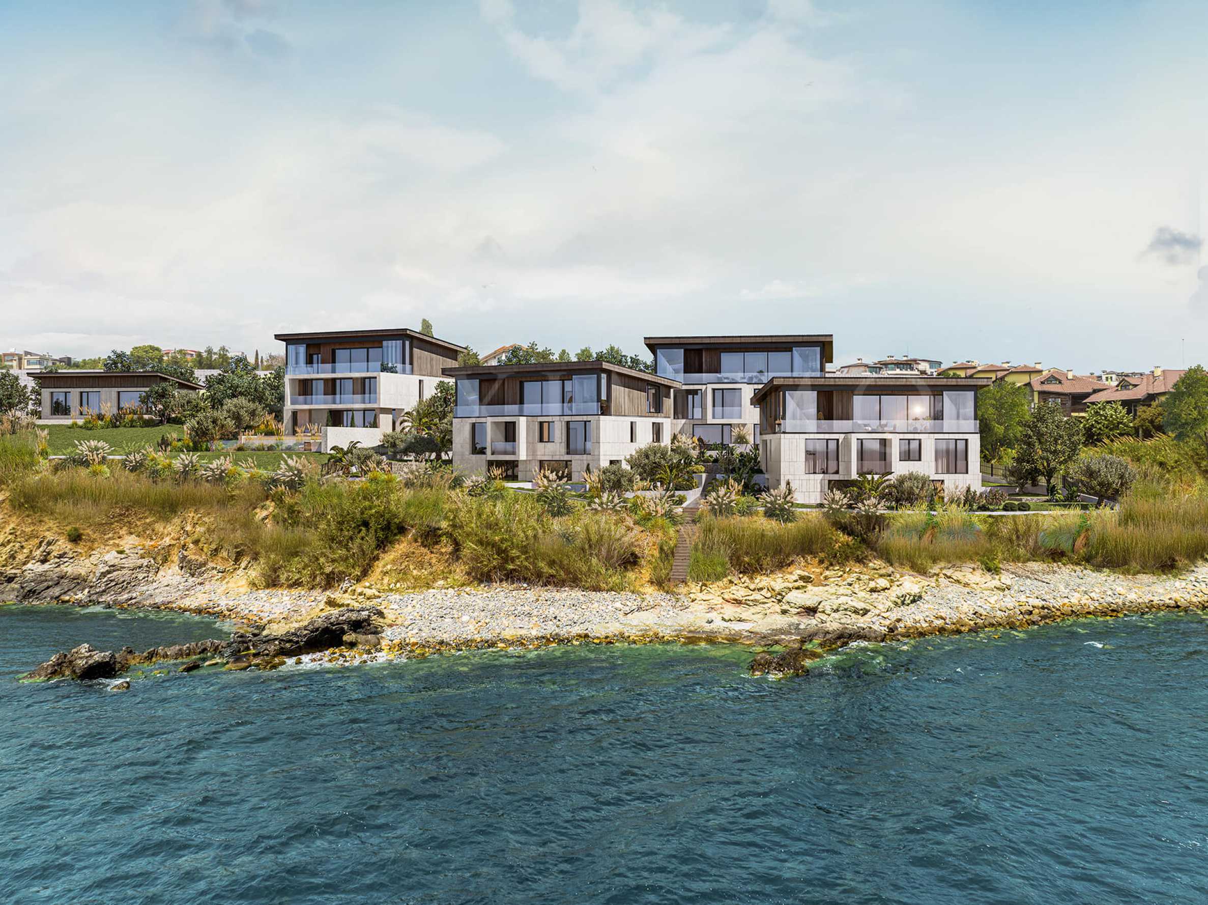 В концепцията на комплекса - модерна визия, фронтална морска гледка от жилищата, стилно озеленена територия и функционален паркинг, контролиран достъп, минимална такса за поддръжка.