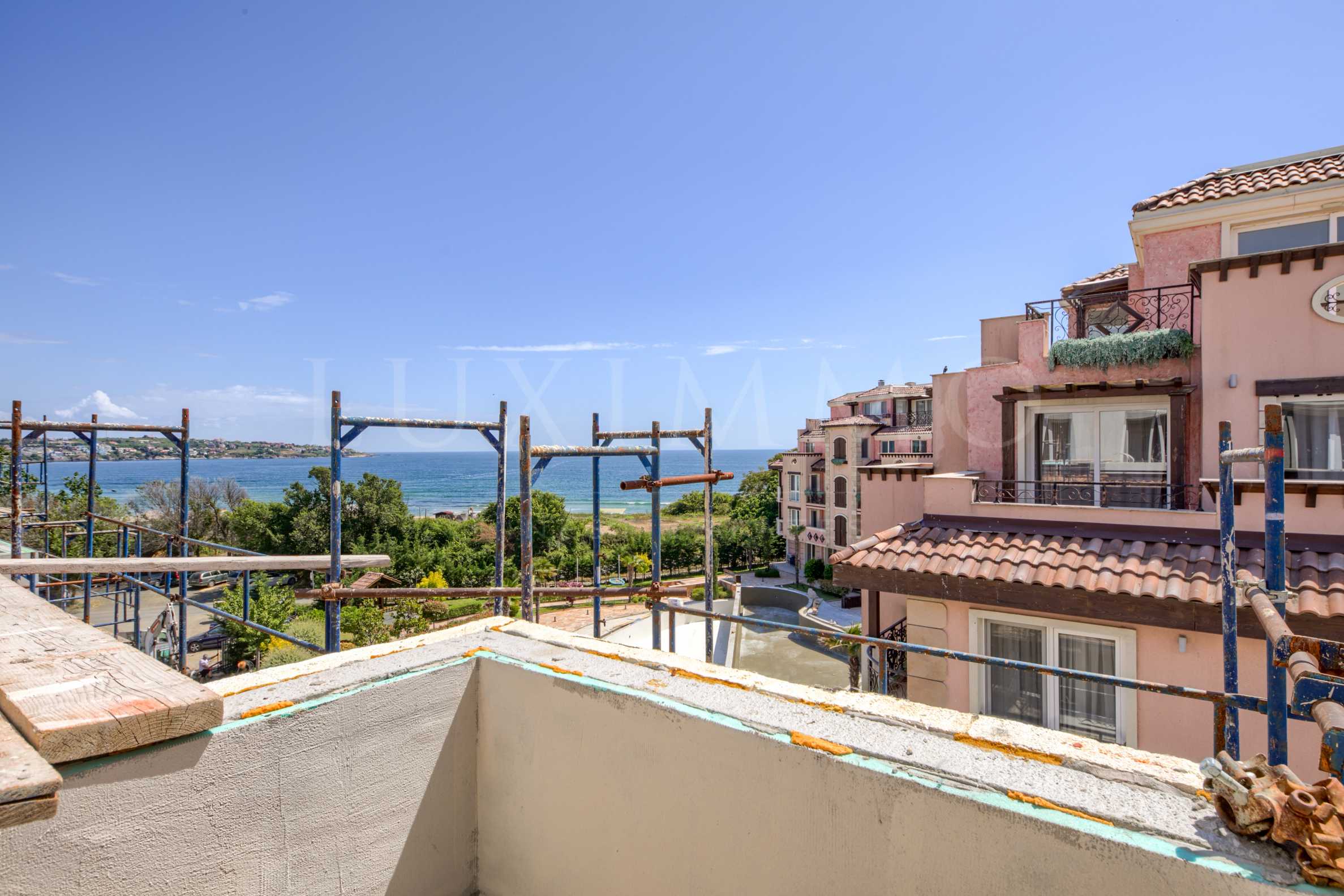 Имотът с обща площ от 48.94 кв.м е разположен на 4-ти етаж и има източно изложение, с морска панорама и гледка към басейна.