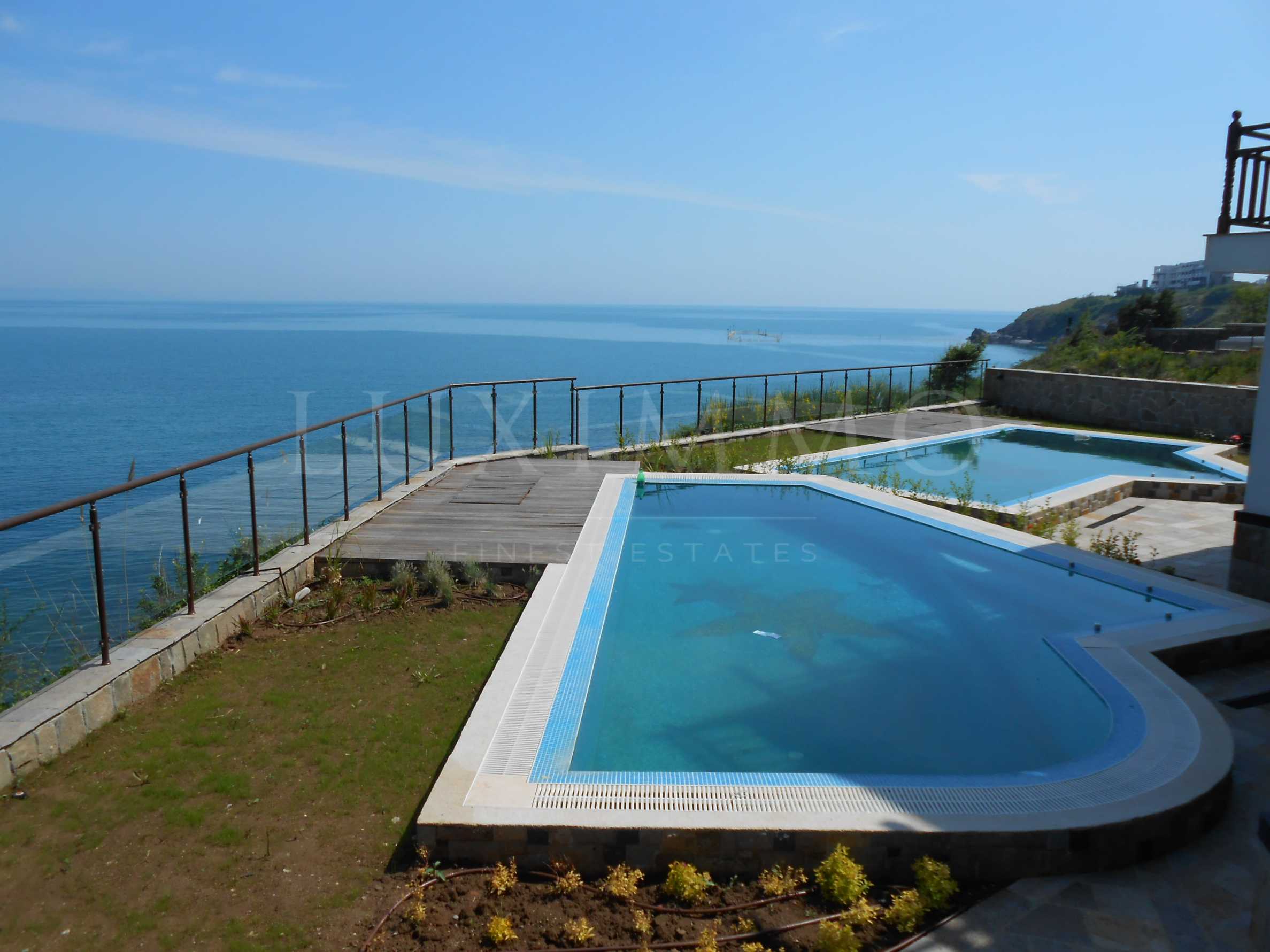 Имотът има собствен външен басейн и детски басейн към него, барбекю, градина и гараж за 2 коли. Предлага невероятна гледка към Райския залив, града и плаж Харманите. Намира се на 3 минути от плажа.