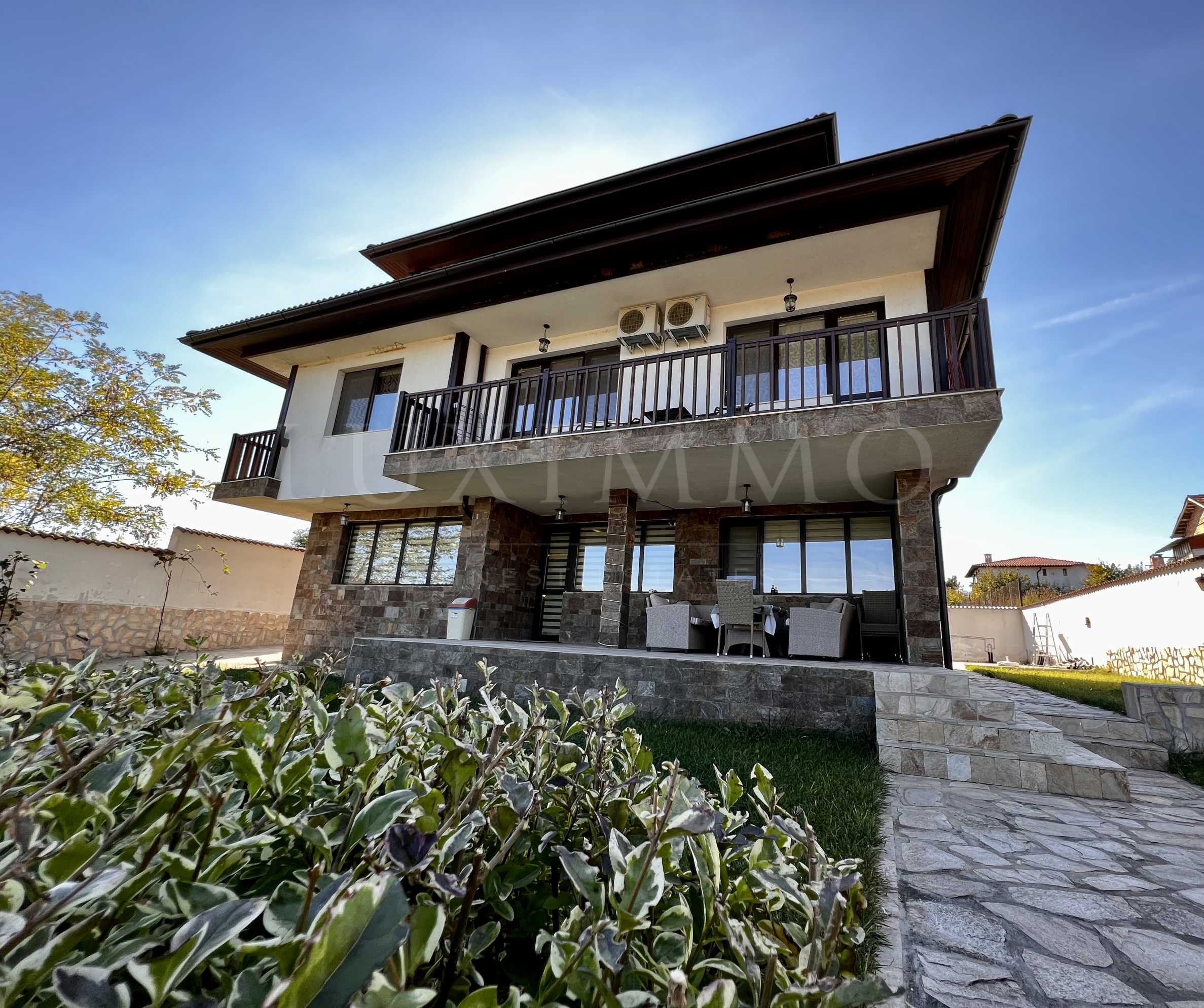 На първо ниво са разположени модерно оборудвана, поръчкова кухня и елегантно мебелиран хол, една спалня. Първото ниво на имота е облицовано с камък, има и обширна веранда за отдих или за хранене на открито. Вътрешното стълбище води до всички нива в жилището, завършено е с качествени мазилки и парапети от ковано желязо, в светли тонове.