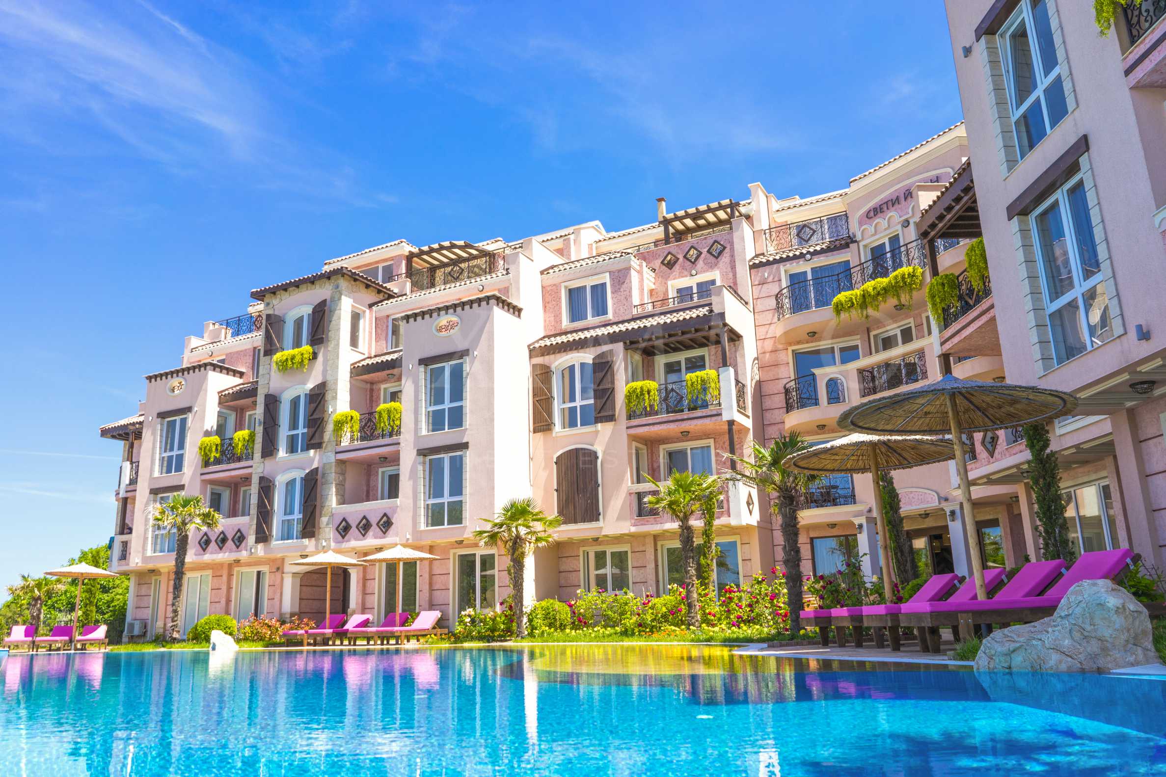 Бъдещите собственици на този имот ще се радват и на отлични удобства на територията, сред които рецепция, паркинг, охрана и поддръжка, инфинити басейн, зони за релакс и красива градина с ландшафтен дизайн.