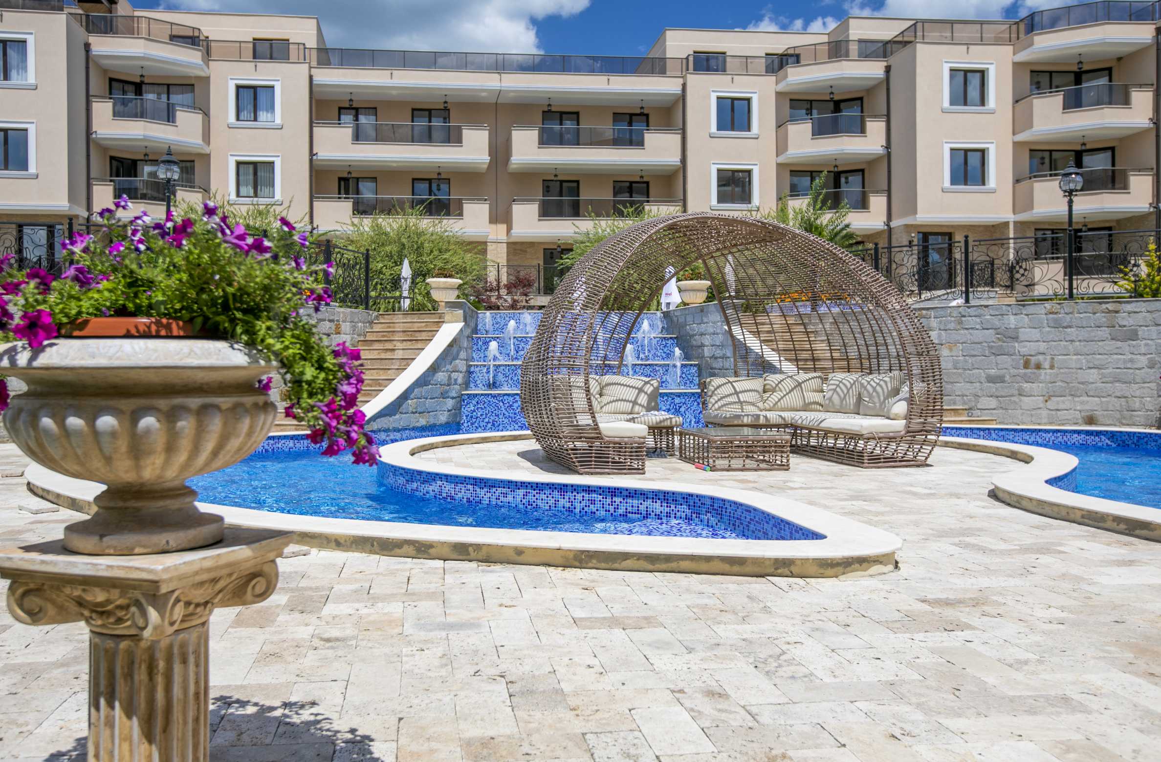 Повечето апартаменти са направени с големи тераси, които предлагат красив изглед към морето. Има поставени леки и елегантни градински арки, които създават романтична атмосфера. По-голямата част от апартаментите са с две спални, което не само позволява да се насладите на фантастична гледка към морето, но също така и към планински пейзаж.