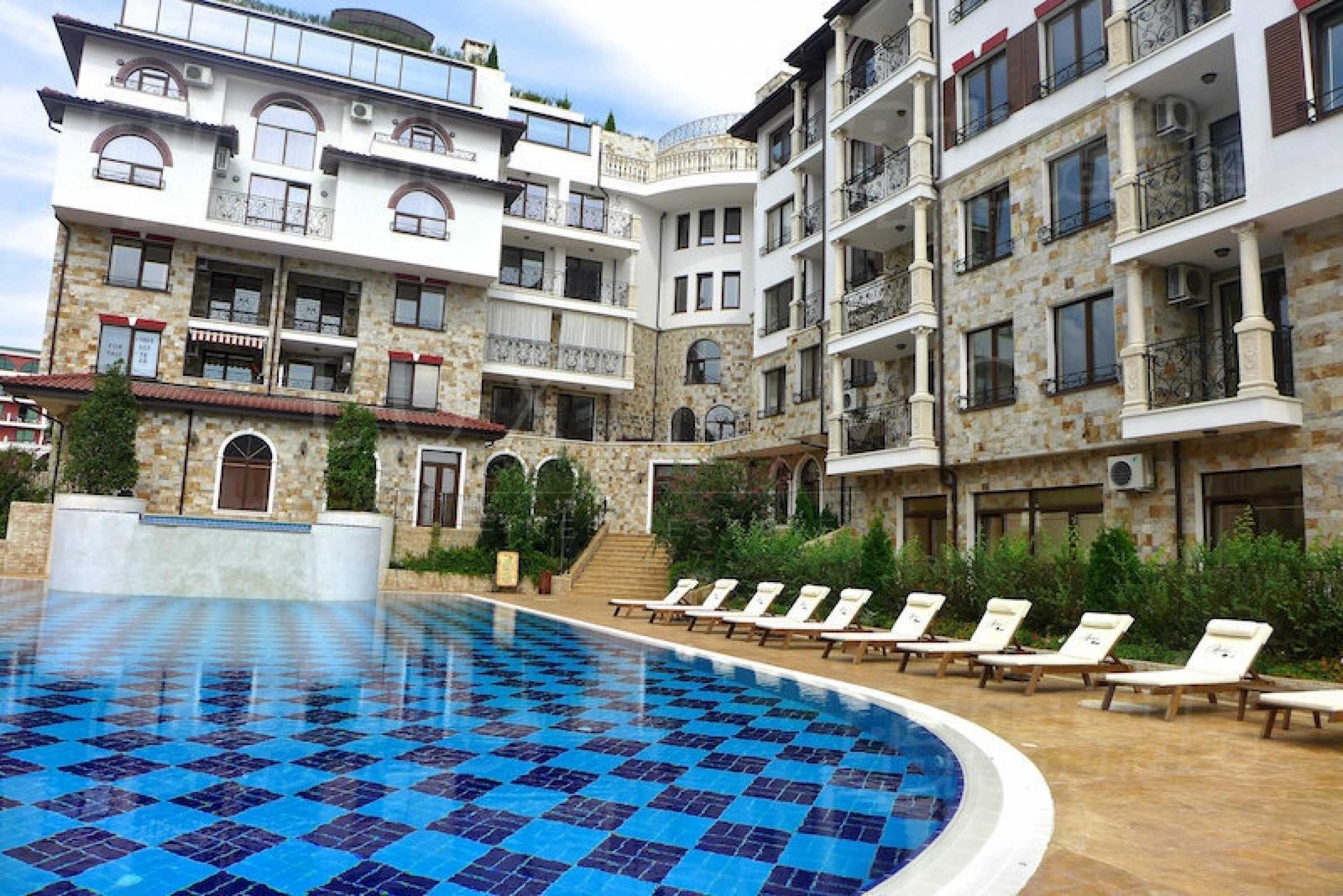 Елегантен двустаен апартамент с обща площ – 45,68 кв.м. находящ се в уникален по рода си затворен комплекс от ваканционни апартаменти, който впечатлява с изтънченост и невероятна гледка към морски залив. Разположен е в южната част на курорта Свети Влас, комплексът отстои на 100 метра от плажната ивица и морето.