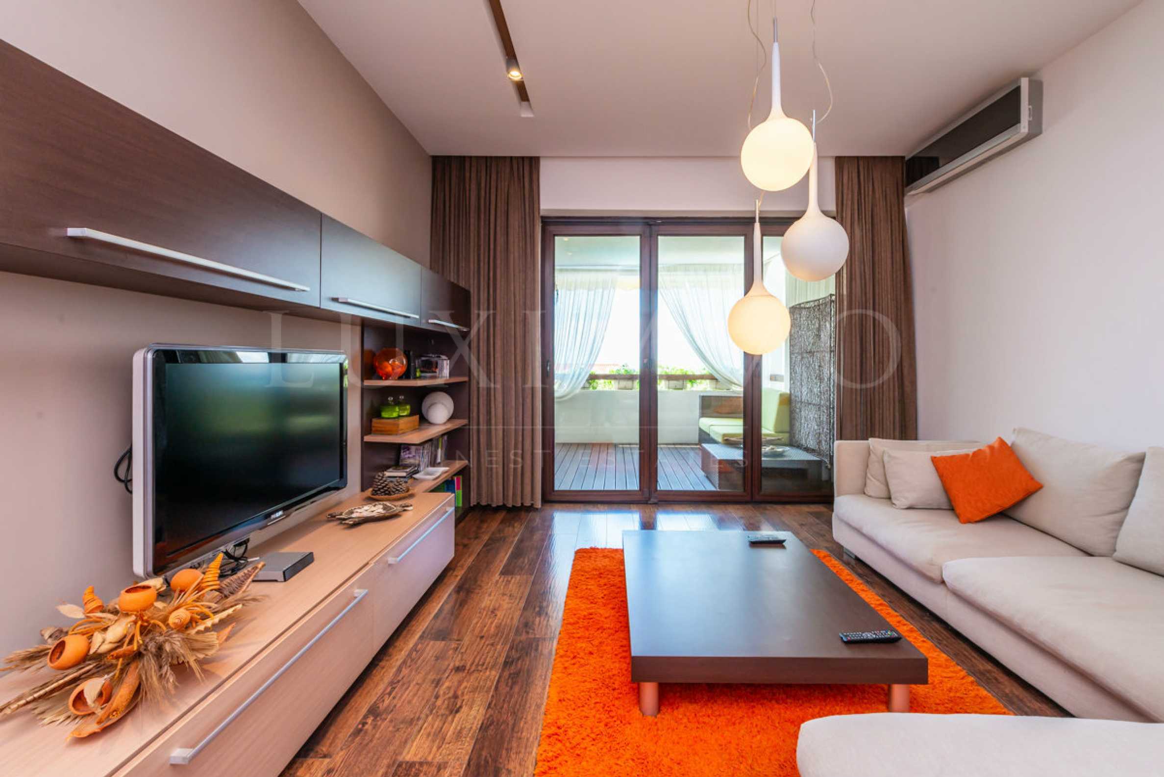 Двустайното жилище е разположено на четвърти етаж с обща площ от 128 кв.м., от които чистата площ е 94.94 кв.м. Подовите настилки са с италиански теракот и паркет (спалнята), стени с латекс и тапети и луксозно италианско обзавеждане по поръчка. Банята с тоалетна е завършена с душ кабина, а голямата панорамна веранда с дървен под и мека мебел с уникална гледка към Слънчев бряг и морето. Новопостроеното тухлено жилище в снабдено с климатици, кабелна телевизия и интернет. Имотът включва и склад от 9.12 кв.м. Собственикът продава още една стая на същия етаж (25 кв.м.) с баня и тоалетна, като може и да се закупи като втора спалня срещу 19000 евро. Продава и лодка REGAL-2220 с дължина 7 метра.