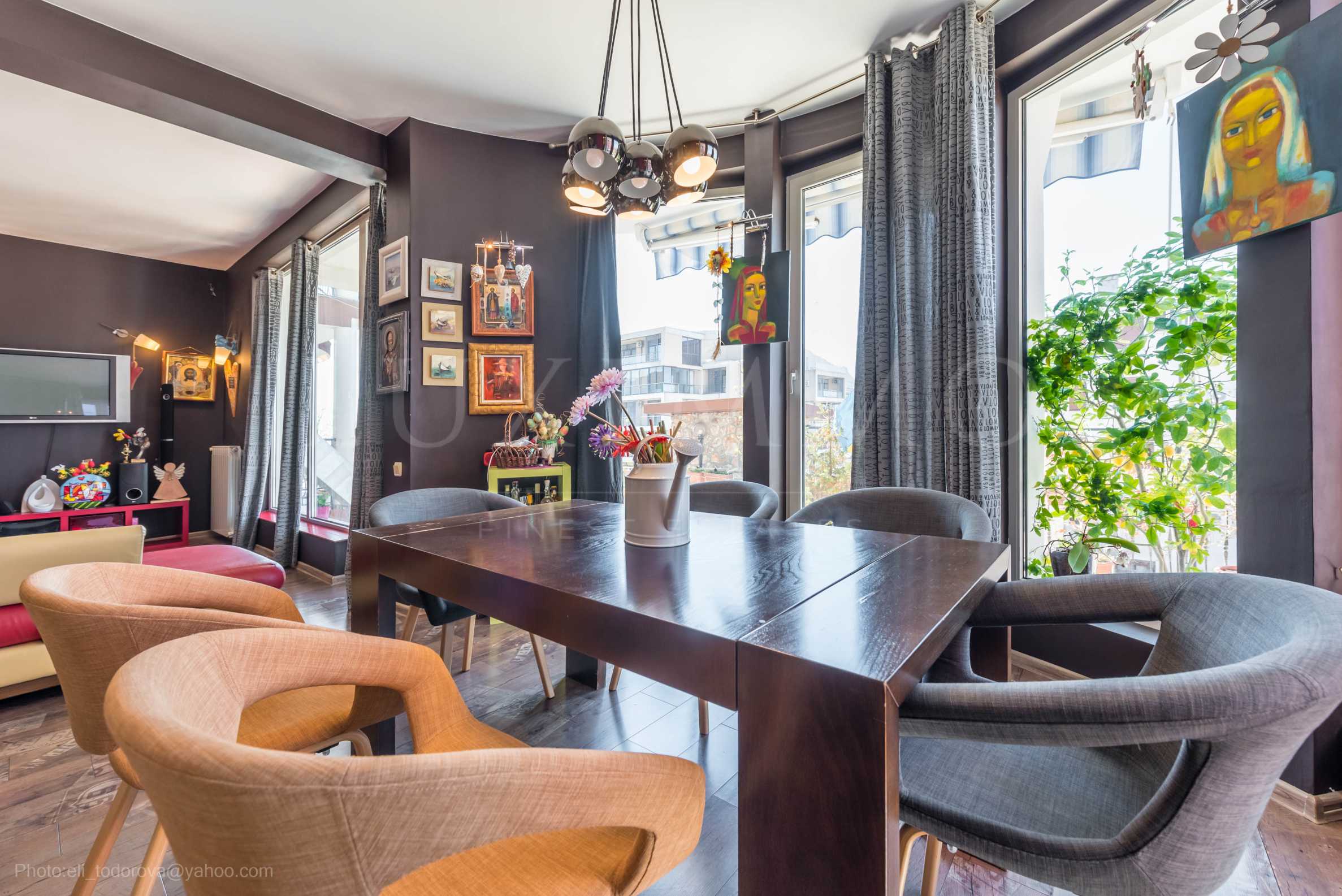 На първи етаж е разположена кухня, всекидневна с трапезария и хол, тоалетна, всичко това в едно помещение с квадратура 80 кв.м, на първия етаж се намира и голяма 45 кв.м панорамна тераса с гледка към морето, стълби - 12 кв.м, водят към втория етаж, където се намират три спални и две бани с тоалетна.