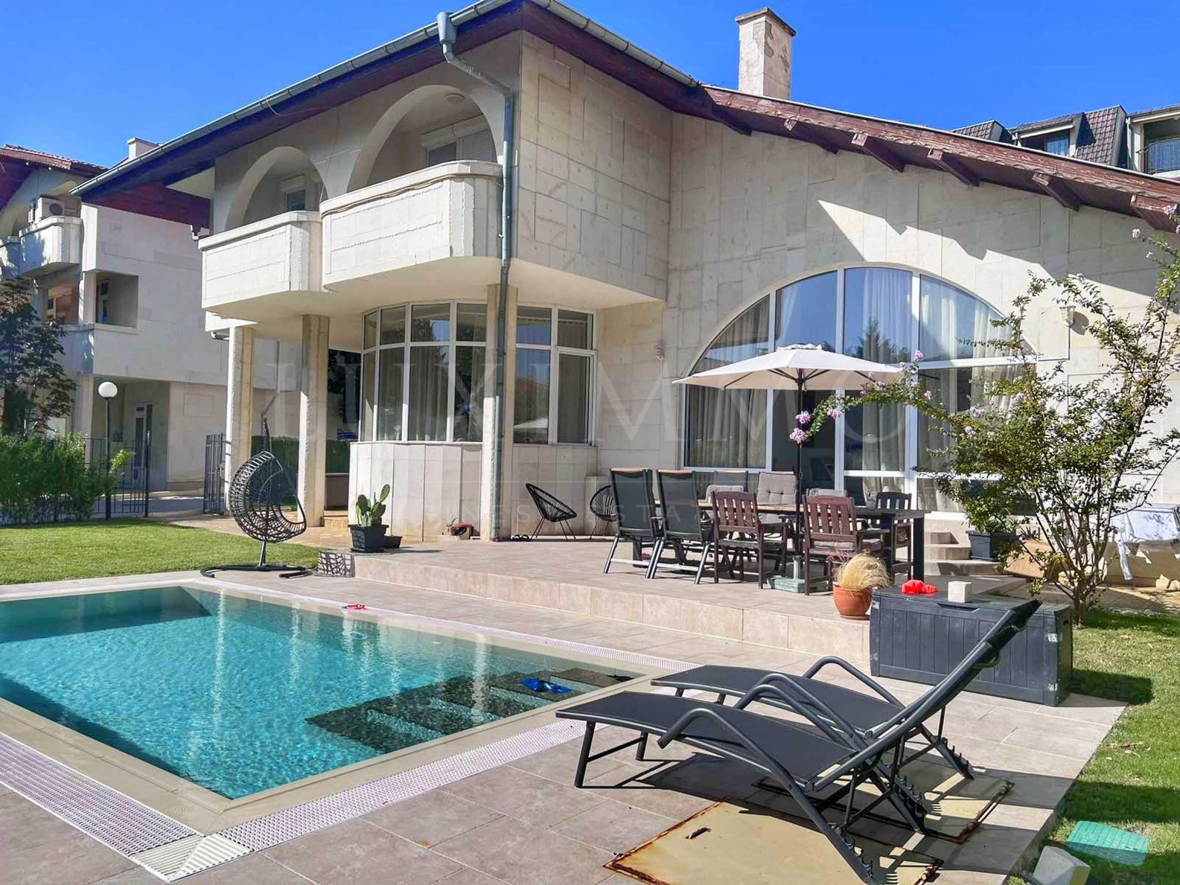 Представяме за продажба модерна двуетажна къща с отопляем басейн, на първа линия от плажната ивица на Свети Влас.