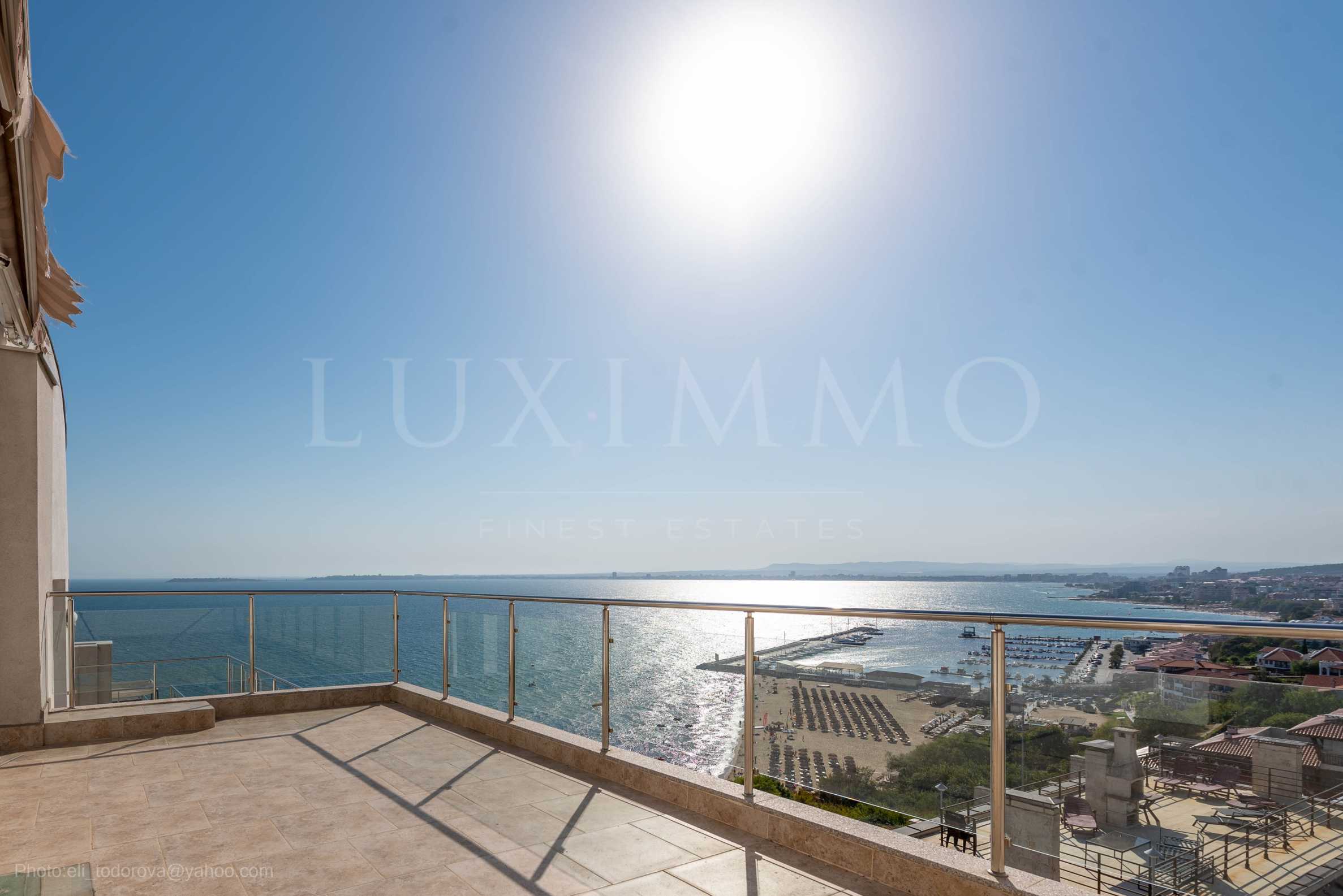 Прекрасен панорамен мезонет за продажба с две спални и три тераси, част от комплекс с удобства на първа линия море в Свети Влас.