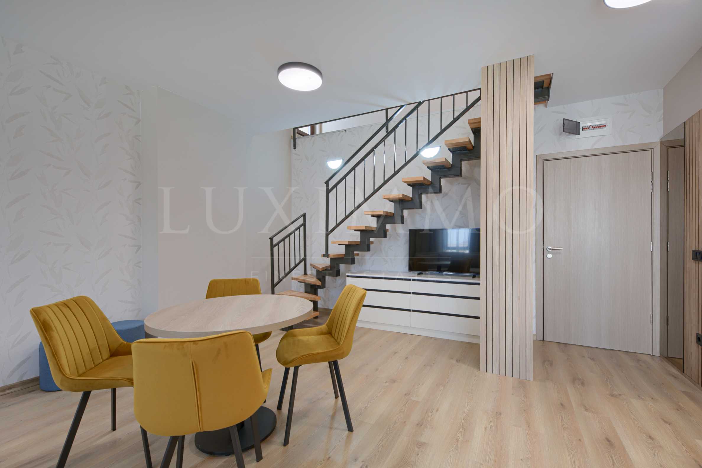 Имотът е разположен на 5-и последен етаж с изложение запад и предлага 99,65 кв.м обща площ. Състои се от всекидневна с излаз на тераса и баня с тоалет на първо ниво, спалня с излаз на тераса и баня с тоалет на второ ниво.
