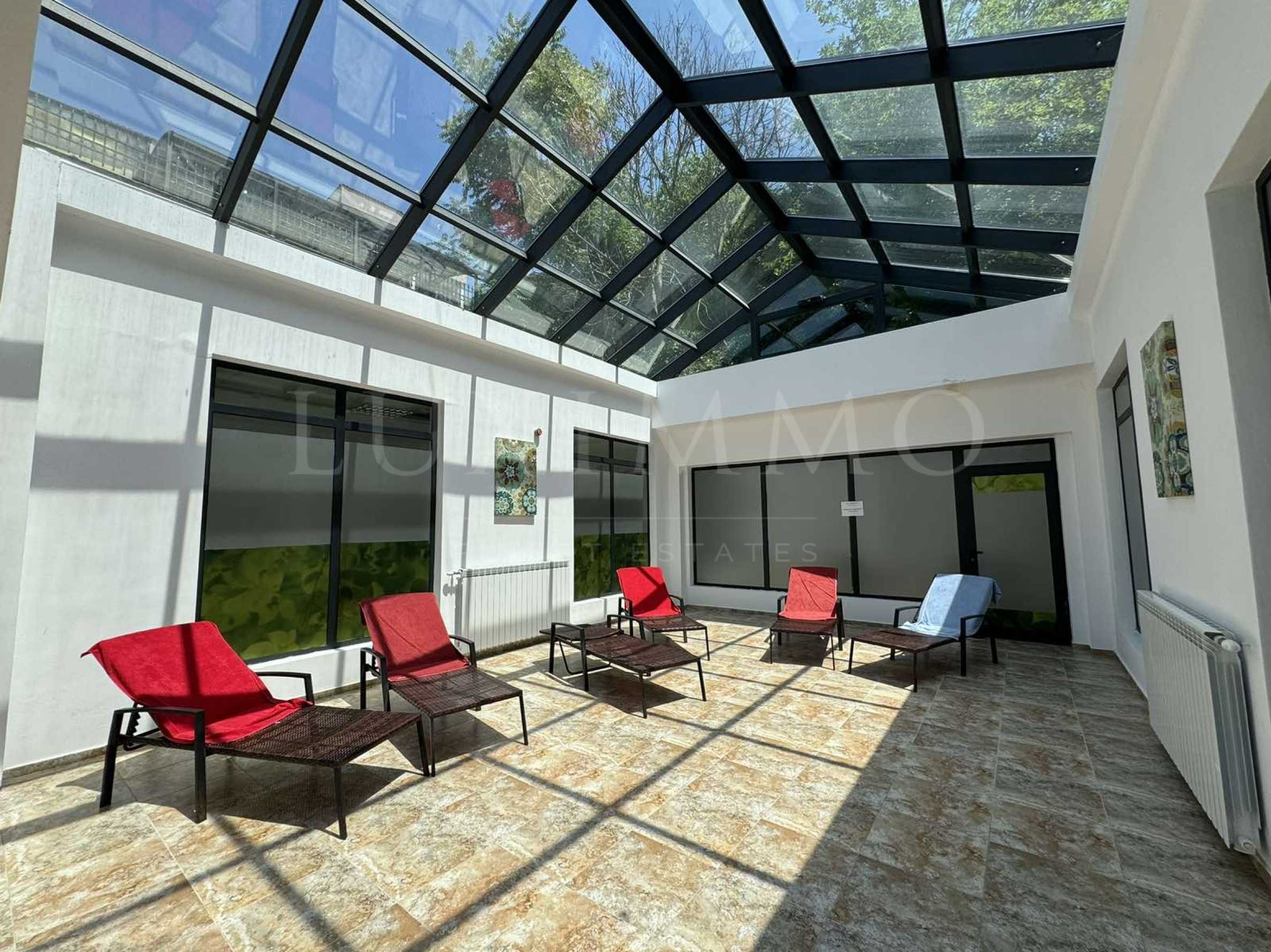 Имотът с обща площ от 509.23 кв.м разполага с масажни кабинети, басейн, джакузи, сауна и парна баня.