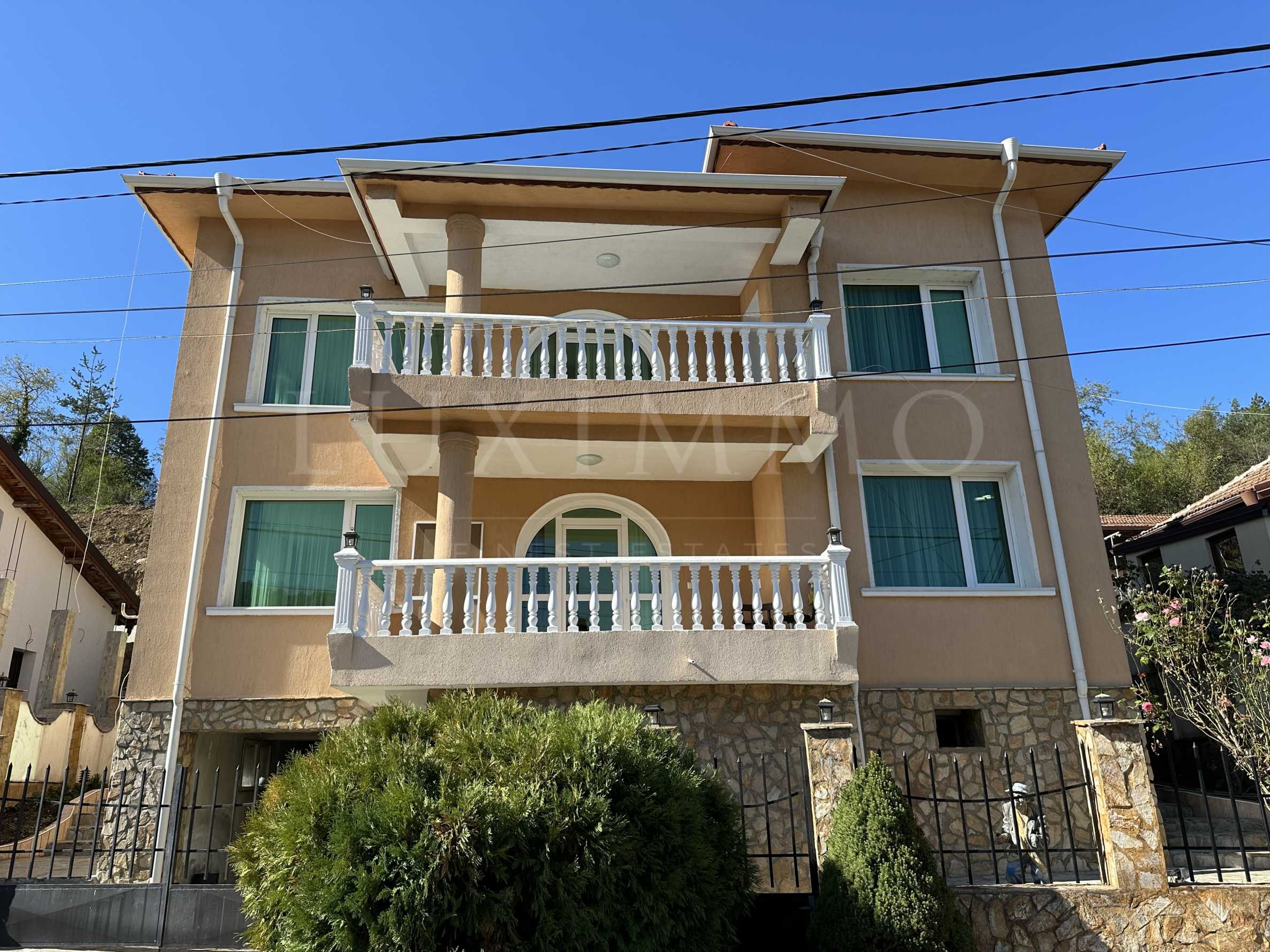 На първия етаж ви посреща светла и просторна всекидневна зона с кухня и трапезария, обединени около уютна камина. Голямата тераса към етажа предлага място за релаксация и панорамна гледка към зеленината наоколо. Вътрешното стълбище води към втория етаж, където са разположени трите спални, още една баня с тоалетна и голяма тераса.
